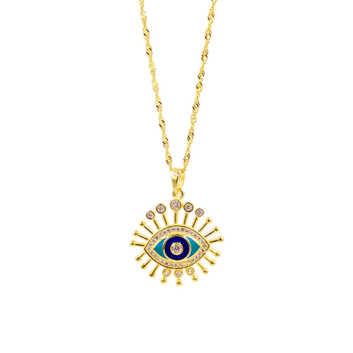 This necklace features a medallion made of gold-plated silver, set with Swarovski Stones and enamel. It is designed with an Evil Eye motif.