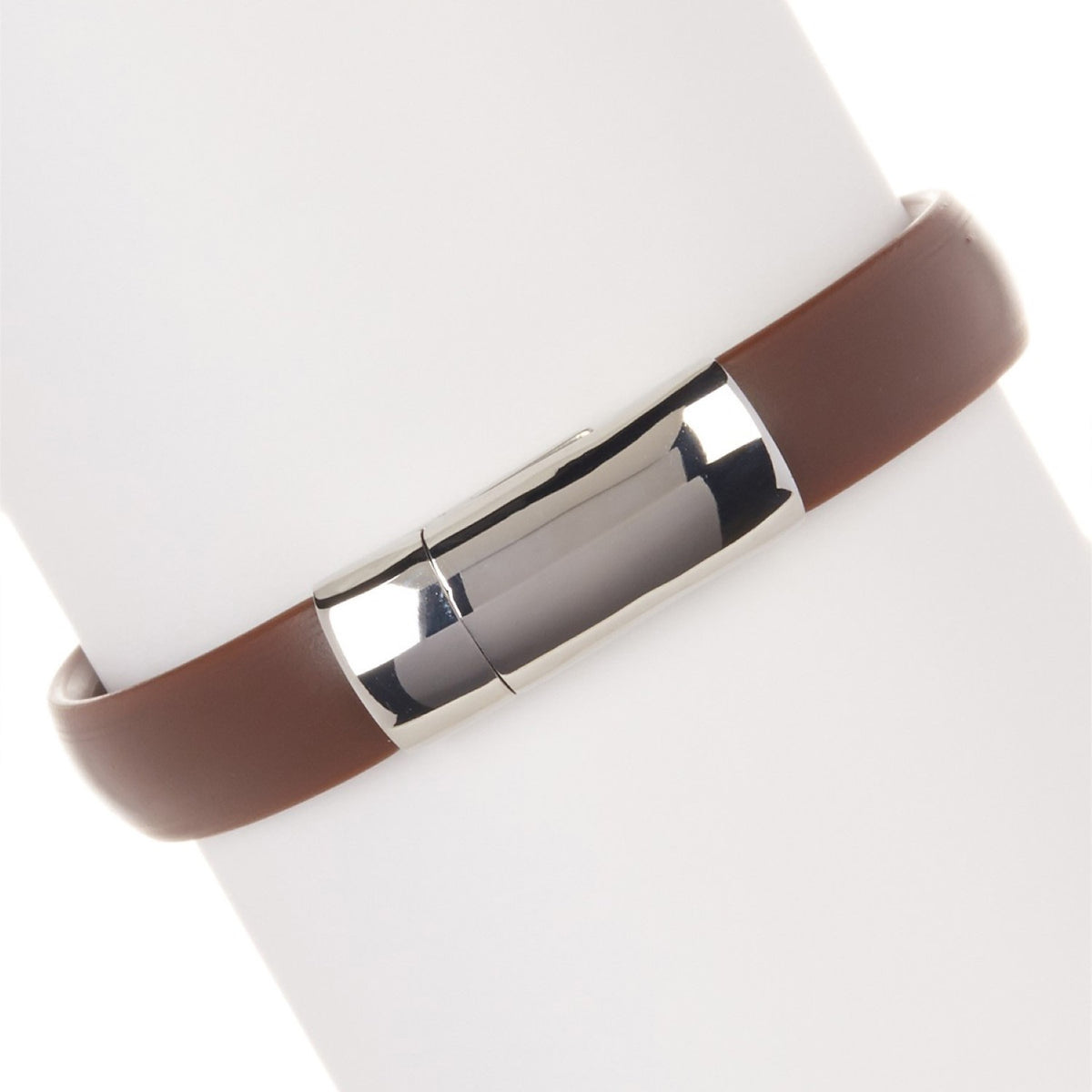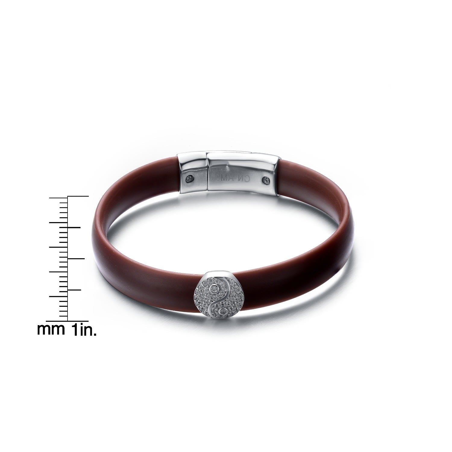 This bracelet features a brown rubber band with a sterling silver magnetic clasp closure. The circular plate is white gold-plated and dotted with cubic zirconia.