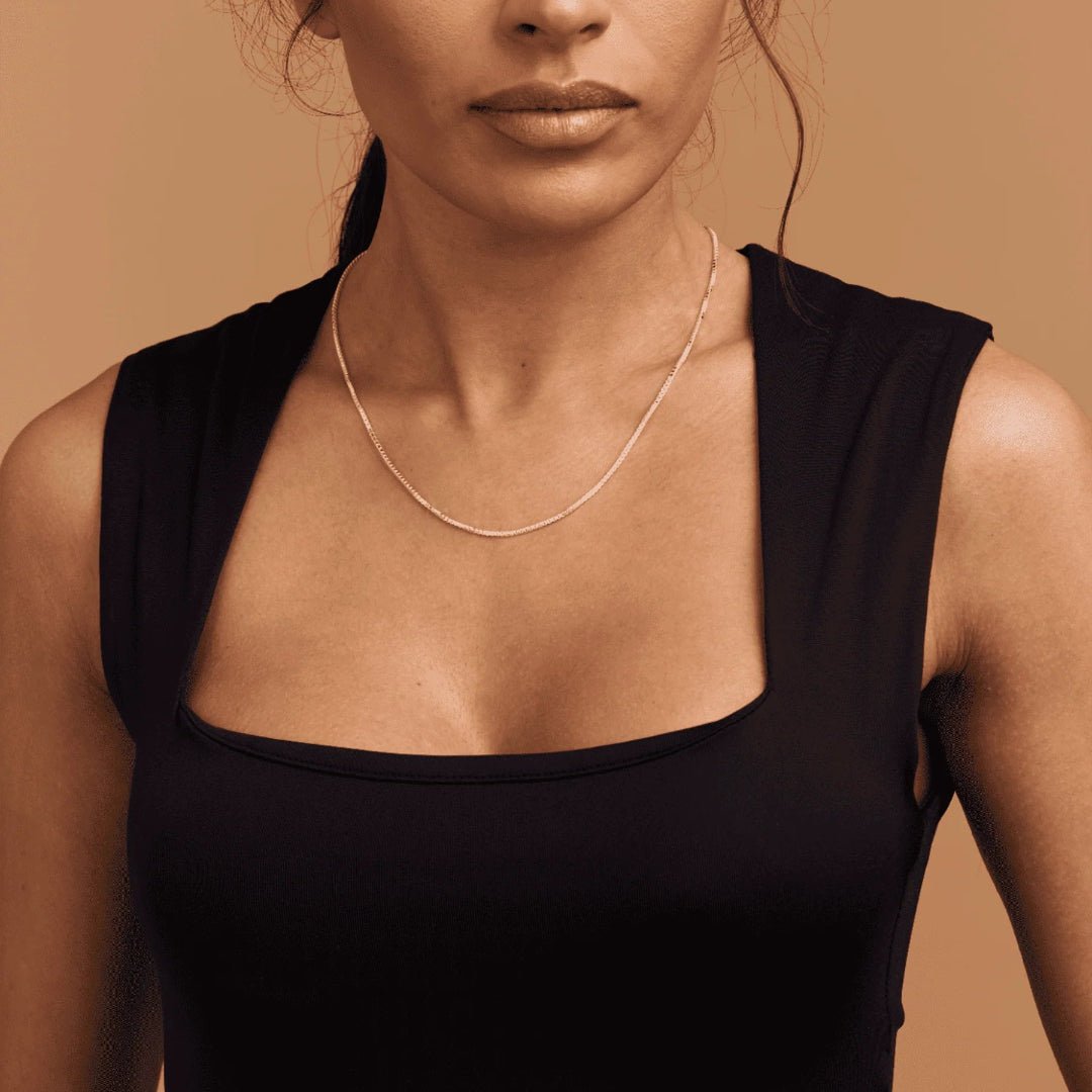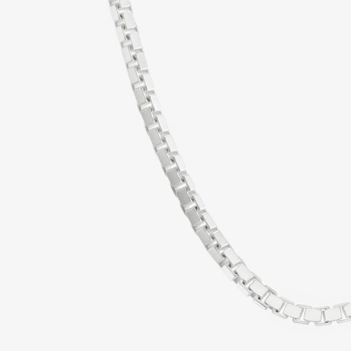 This Silver Boxed Chain Necklace by 7879 features a bold, distinctive profile that makes an impactful statement. The sturdy box links provide exceptional strength and durability. With its unique square design and sleek, minimalist look, this necklace adds depth to a layered chain ensemble and stands out beautifully when worn alone. It is designed to be worn every day and will never lose its luster.