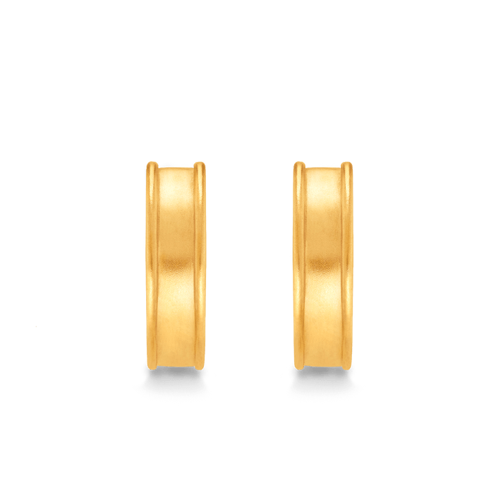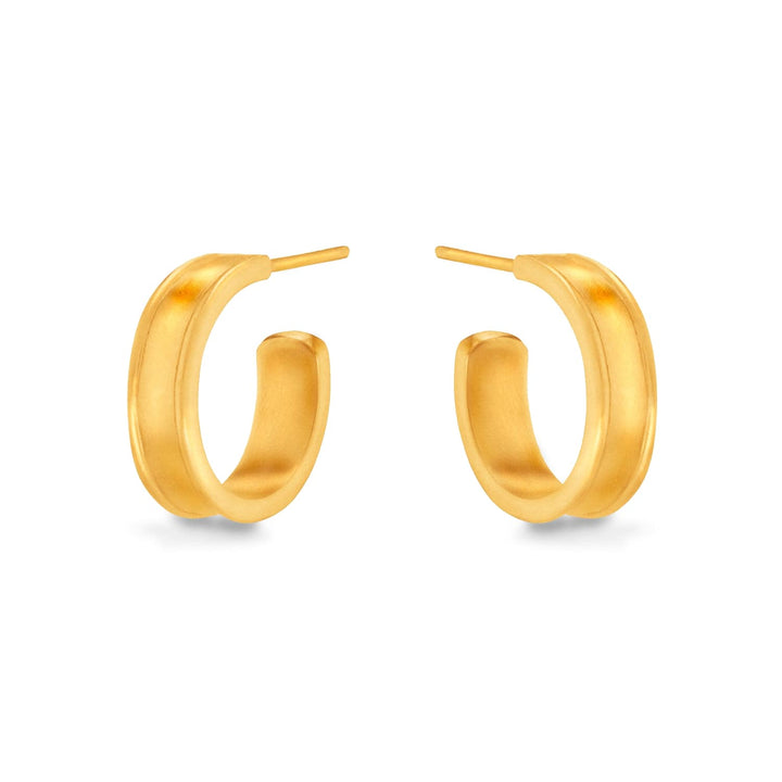 These earrings are handcrafted from pure gold with a "liquid metal" finish in an iconic hoop design.