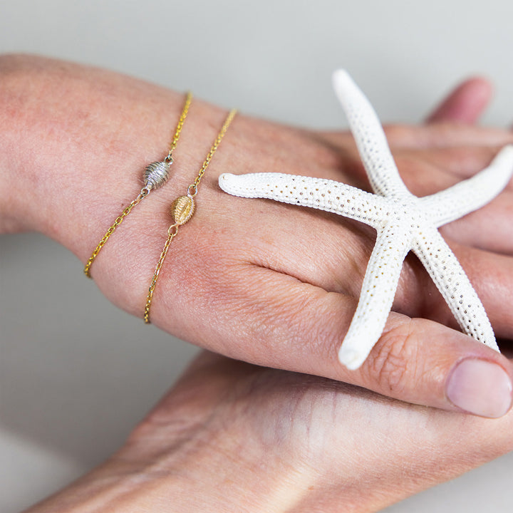 These Yemaya Gold Bracelets by &Lottie are handcrafted with the finest sterling silver and gold materials and feature cowrie shells, a timeless symbol of protection and wealth. Inspired by the Yemaya Goddess of the ocean, these bracelets exude a sense of strength and femininity. Wear it as a reminder of the power and beauty of the sea, or layer it with other bracelets to create a unique, personalized stack.