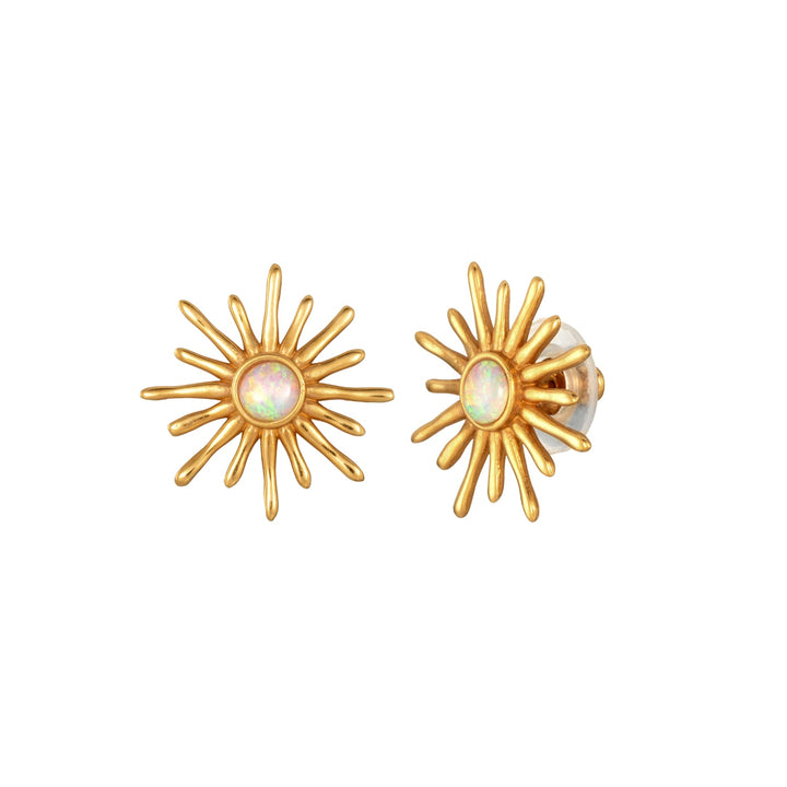 These Arka Opal Stud Earrings by &Lottie are a stunning piece of jewelry that is sure to catch the eye. Their name, which means "ray of light" in Sanskrit, perfectly captures the luminous and radiant quality of the beautiful opal stones. Crafted from gold-plated silver, these earrings are the perfect accessory to add a sparkle of elegance and glamour to any outfit.