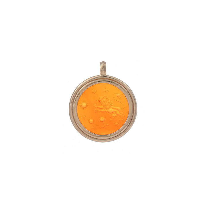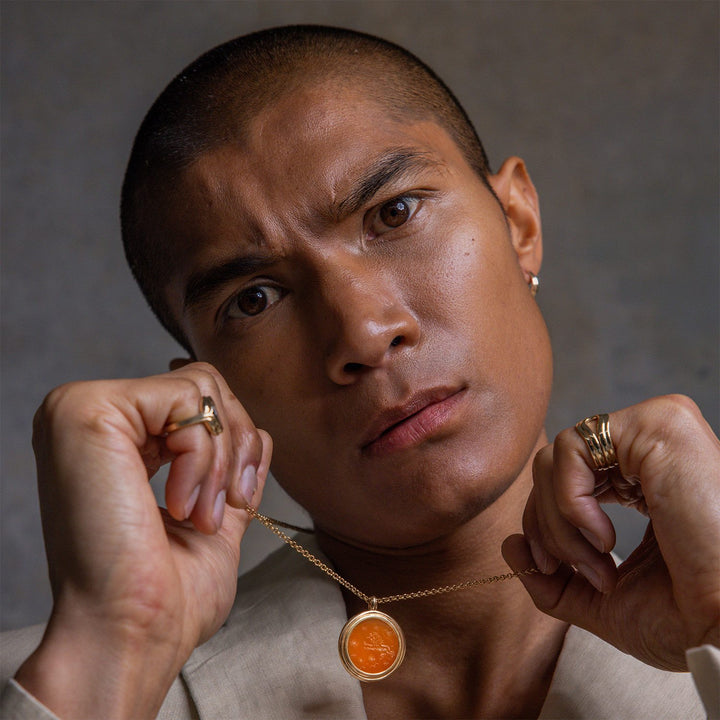 This pendant is crafted from NHS recycled silver with gold vermeil and features a hand-carved intaglio carnelian. It has a width of 24mm.