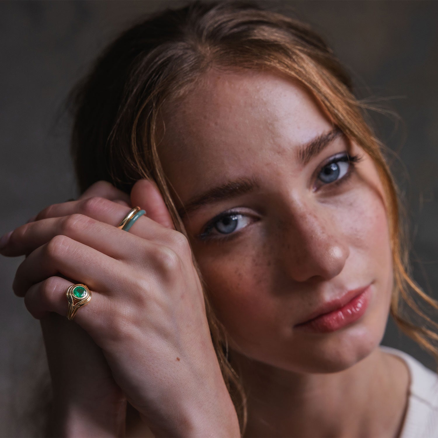 This Parallel Emerald Pinky Ring by &Lottie is a fusion of modern design and timeless elegance. With its parallel curves delicately encircling a mesmerizing emerald gemstone, this ring adds a distinctive flair to your style. Designed to be worn on the pinky finger, it's a unique statement piece that effortlessly captures attention and accentuates your individuality, perfect for both everyday wear and special occasions.