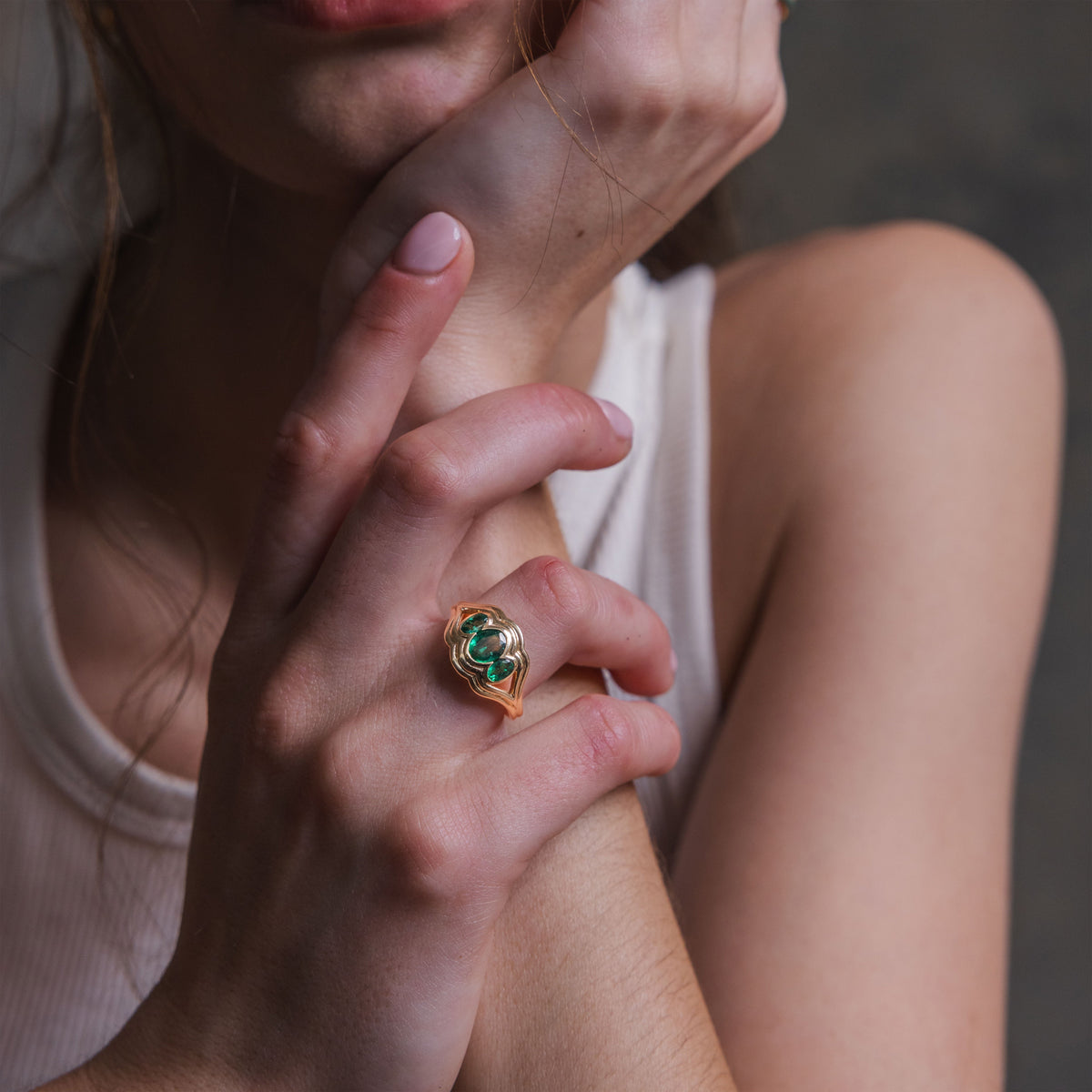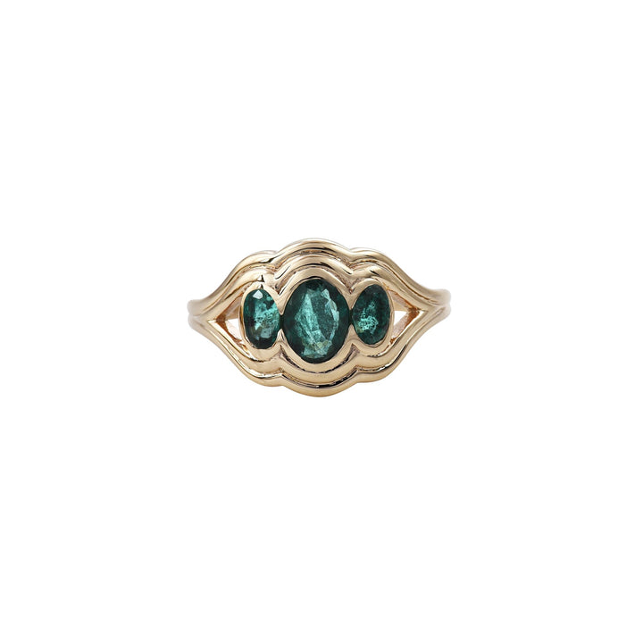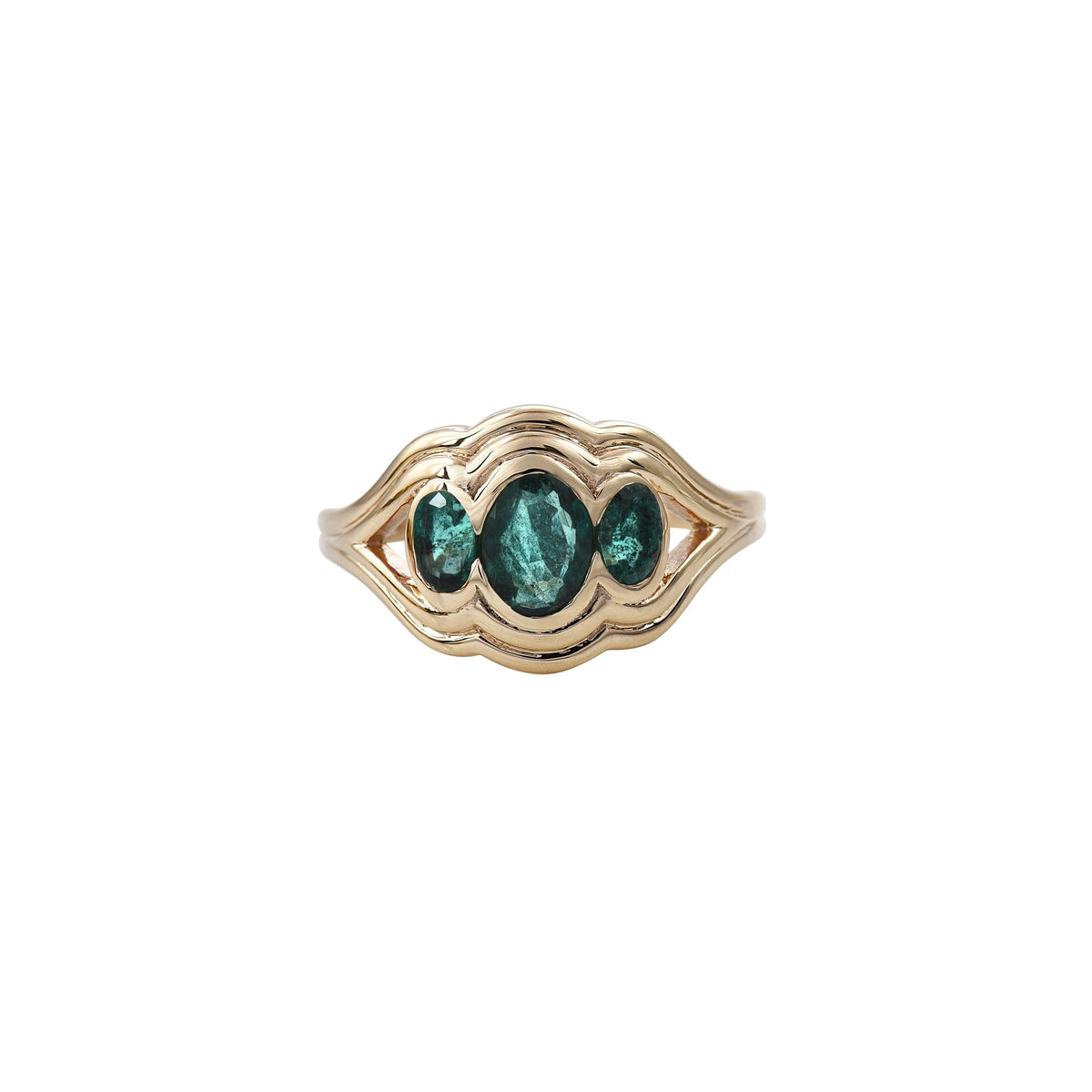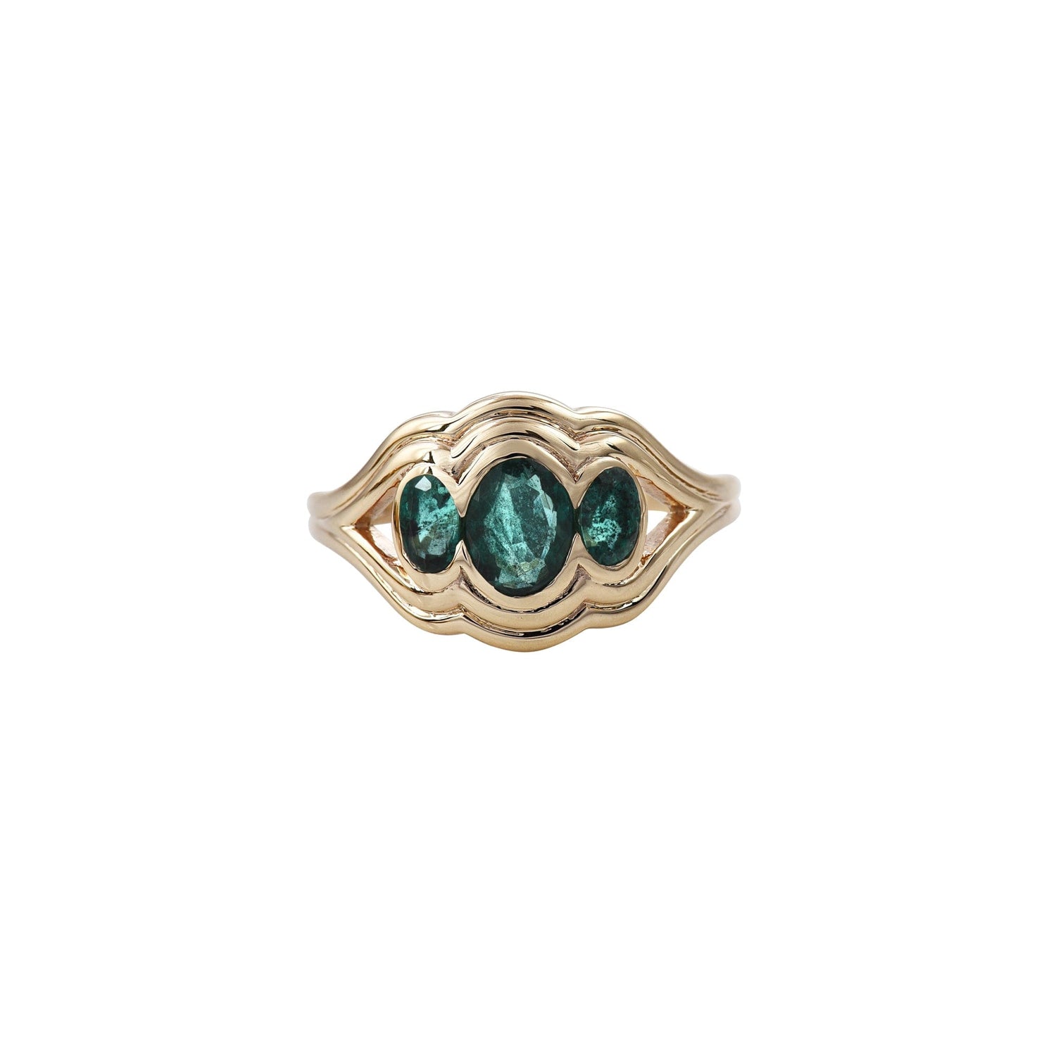 The Trio Emerald Ring by &Lottie is a chic and elegant piece crafted with precision. This stunning ring is designed in 9kt yellow gold with parallel rails that gracefully guide the eye to the three central emeralds. It effortlessly combines timeless beauty with contemporary sophistication, making it a radiant accessory for any occasion.