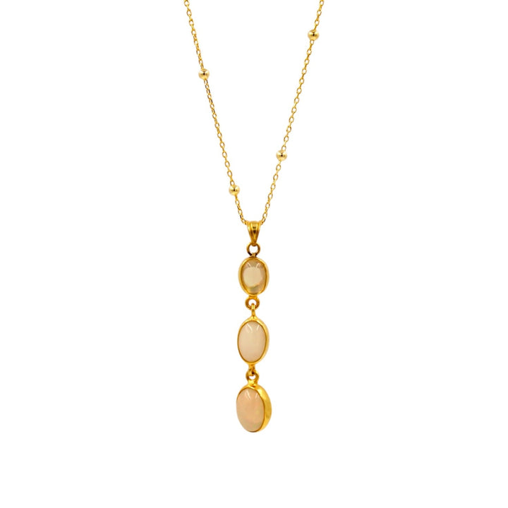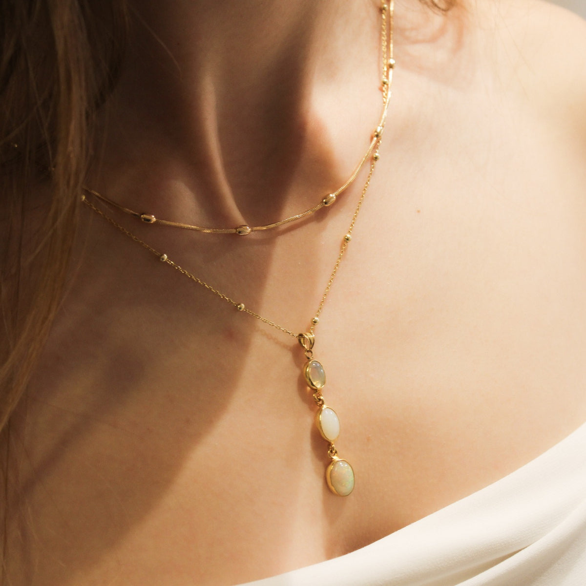 This necklace is made from gold-plated sterling silver and features an opal stone. It is made in Turkey.