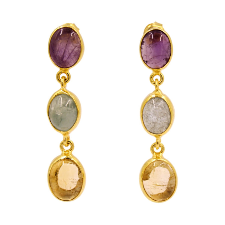 Handcrafted from sterling silver with a gold-plated finish, these earrings are adorned with natural aquamarine, citrine, and amethyst gemstones.