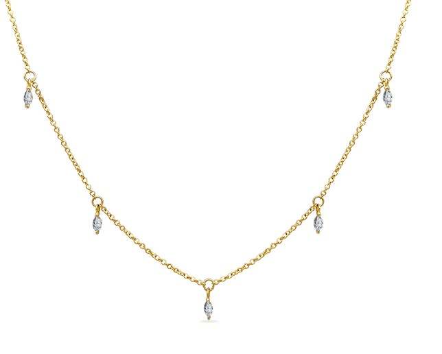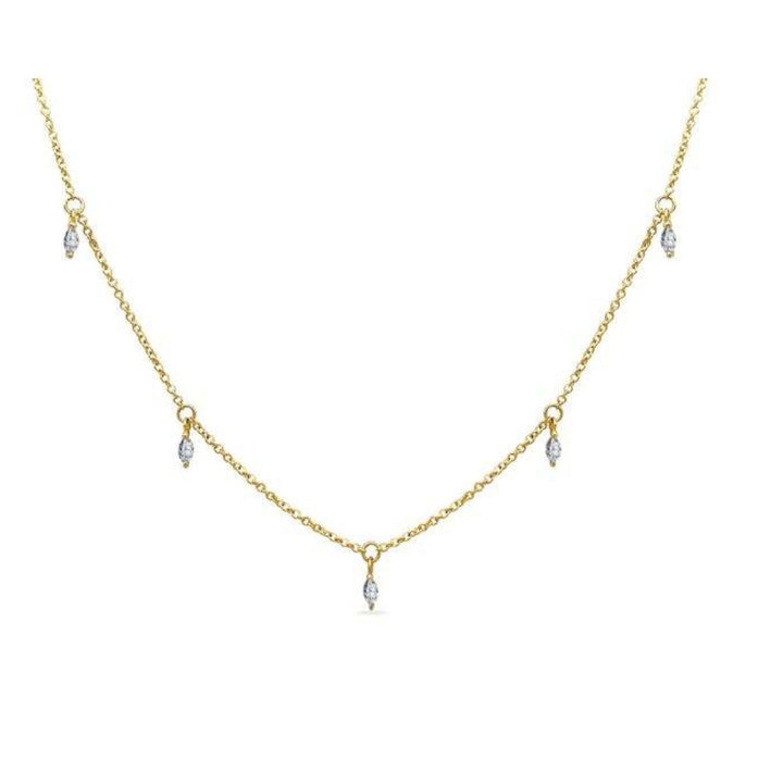 This chain necklace is made of 9k solid gold and features five moissanite teardrop gems. The adjustable length is 40cm and 45cm.