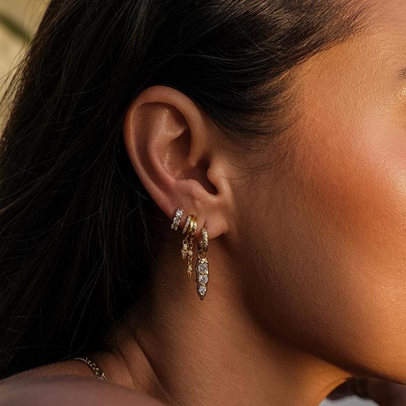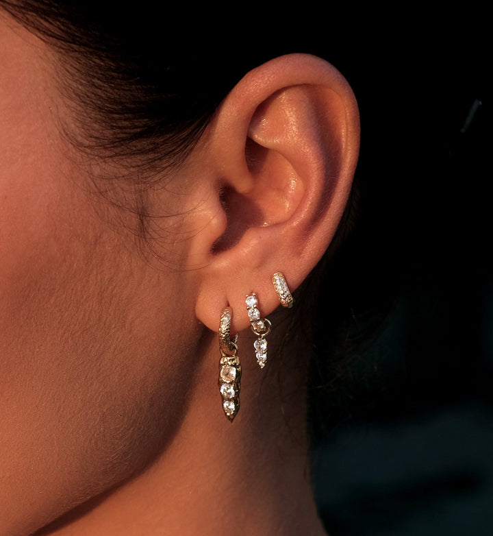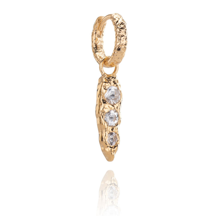 This is a single earring charm made from recycled 925 sterling silver with a 2.5 micron plating of 14k gold vermeil. It features three white topaz gemstones and the charm is removable.