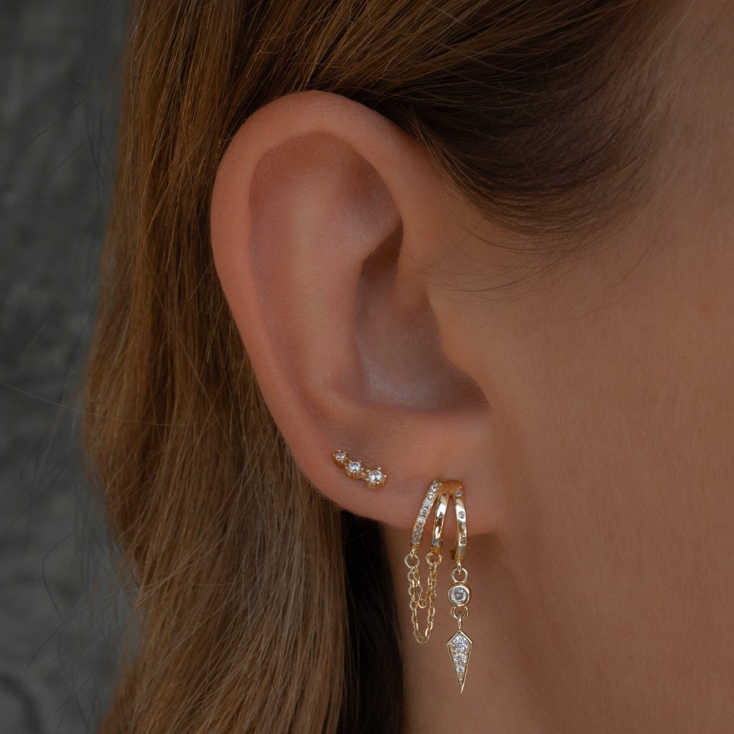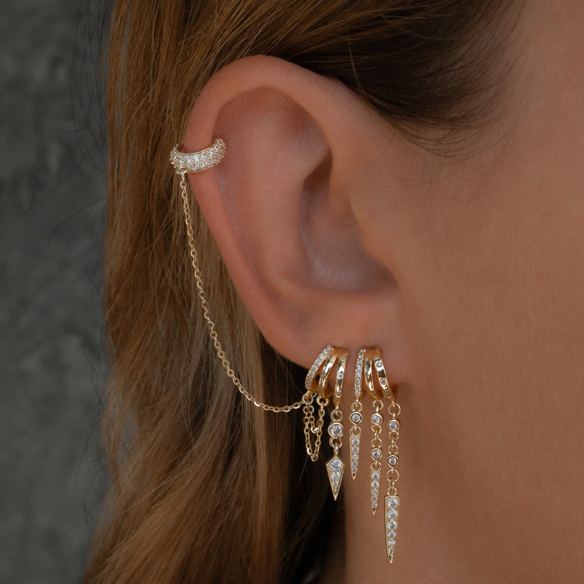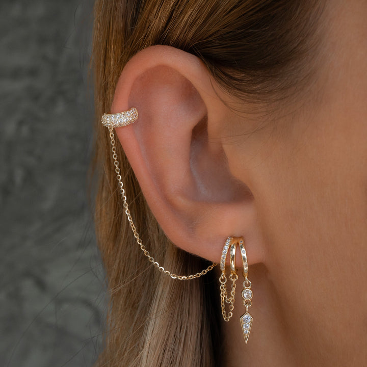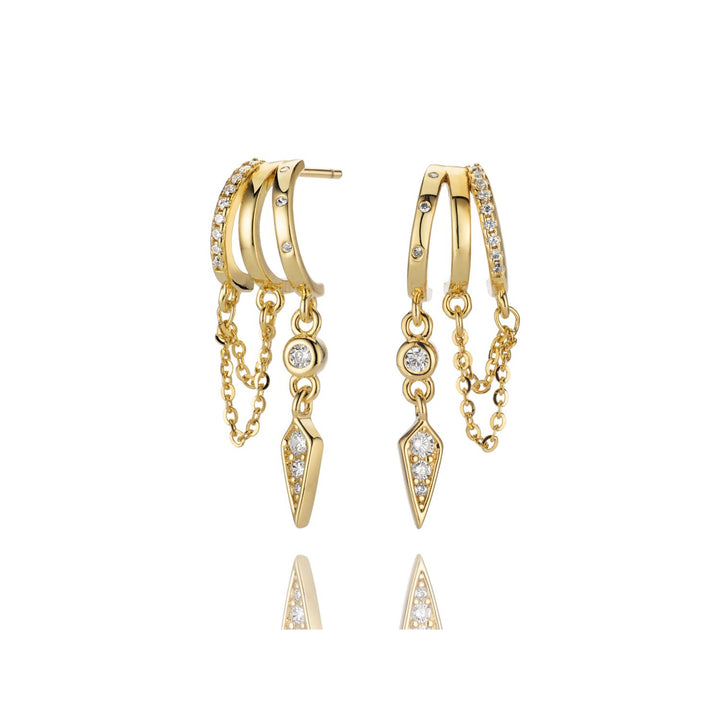 These Palma Charm Earrings by Aaria London are a delicate yet edgy addition to any jewelry collection. Crafted from premium sterling silver and plated in 14k gold, each earring features a spike charm adorned with sparkling cubic zirconia and a double chain. Their subtle and delicate design makes them perfect for the first piercing or for layering in a second piercing for a more dynamic look.
