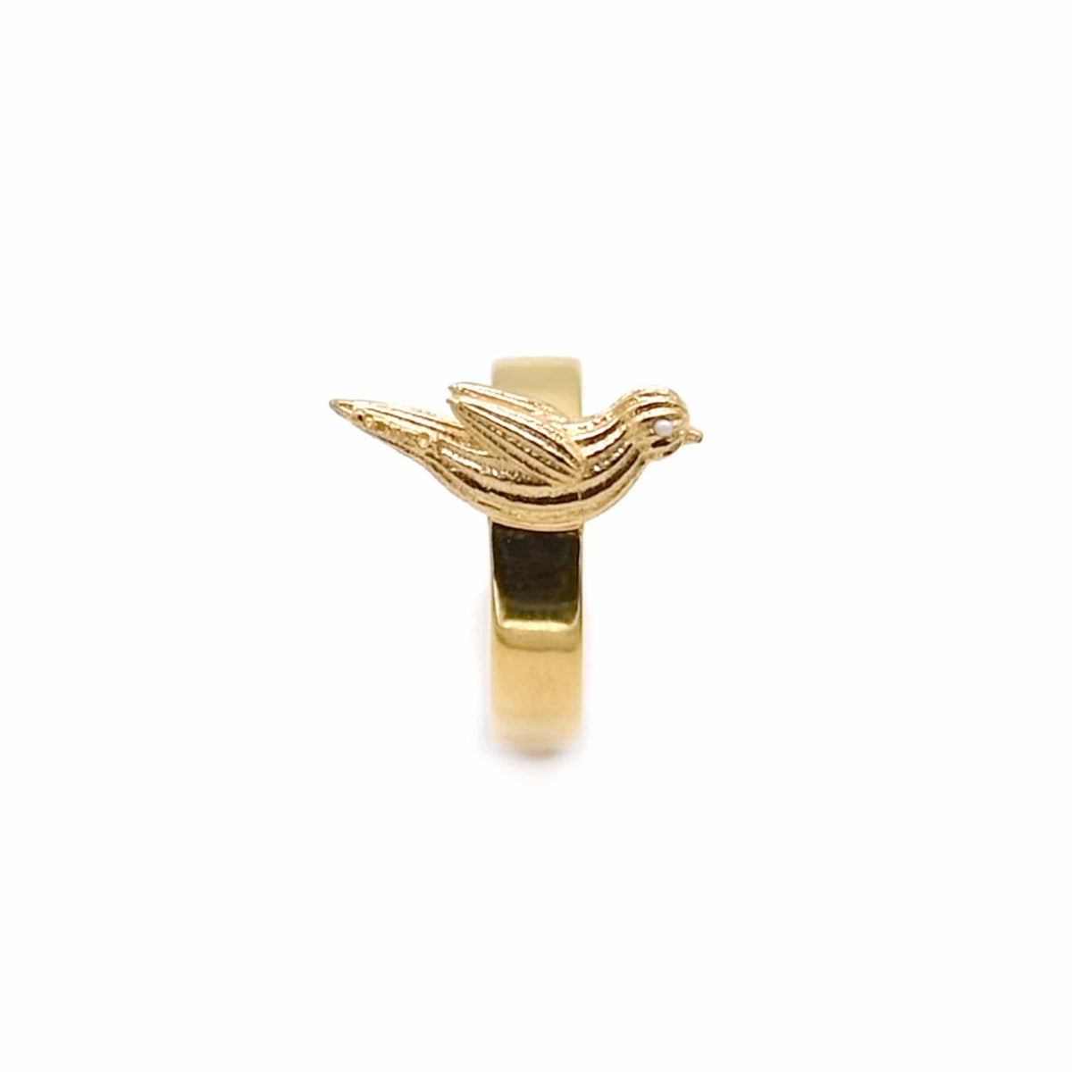 This Robin Pearl Gold Vermeil Ring by Adiba is a beautiful and meaningful piece. The ring is made with an 18k gold vermeil finish over a sterling silver base and features precious pearls. The robin bird symbolizes happiness and good luck, making this ring a perfect and elegant accent for any outfit.
