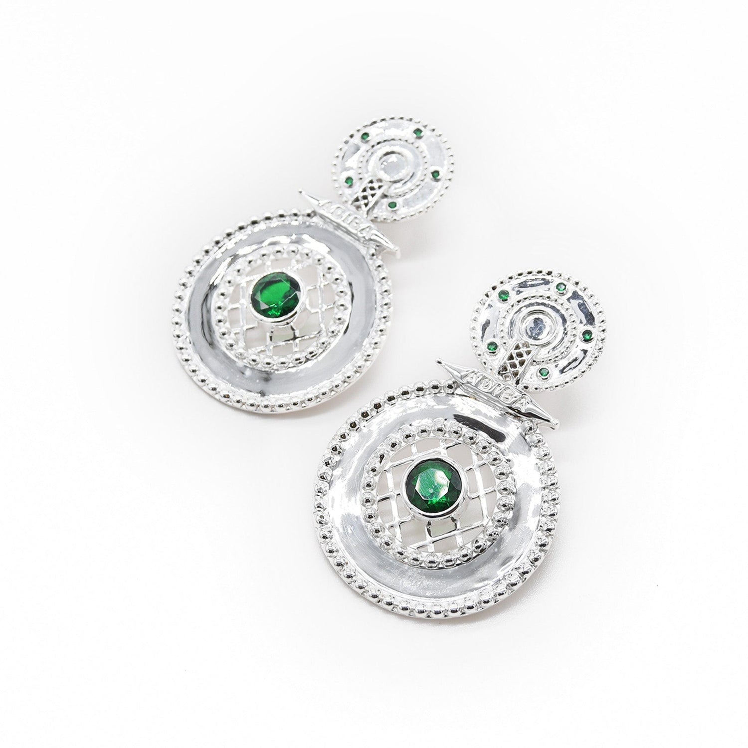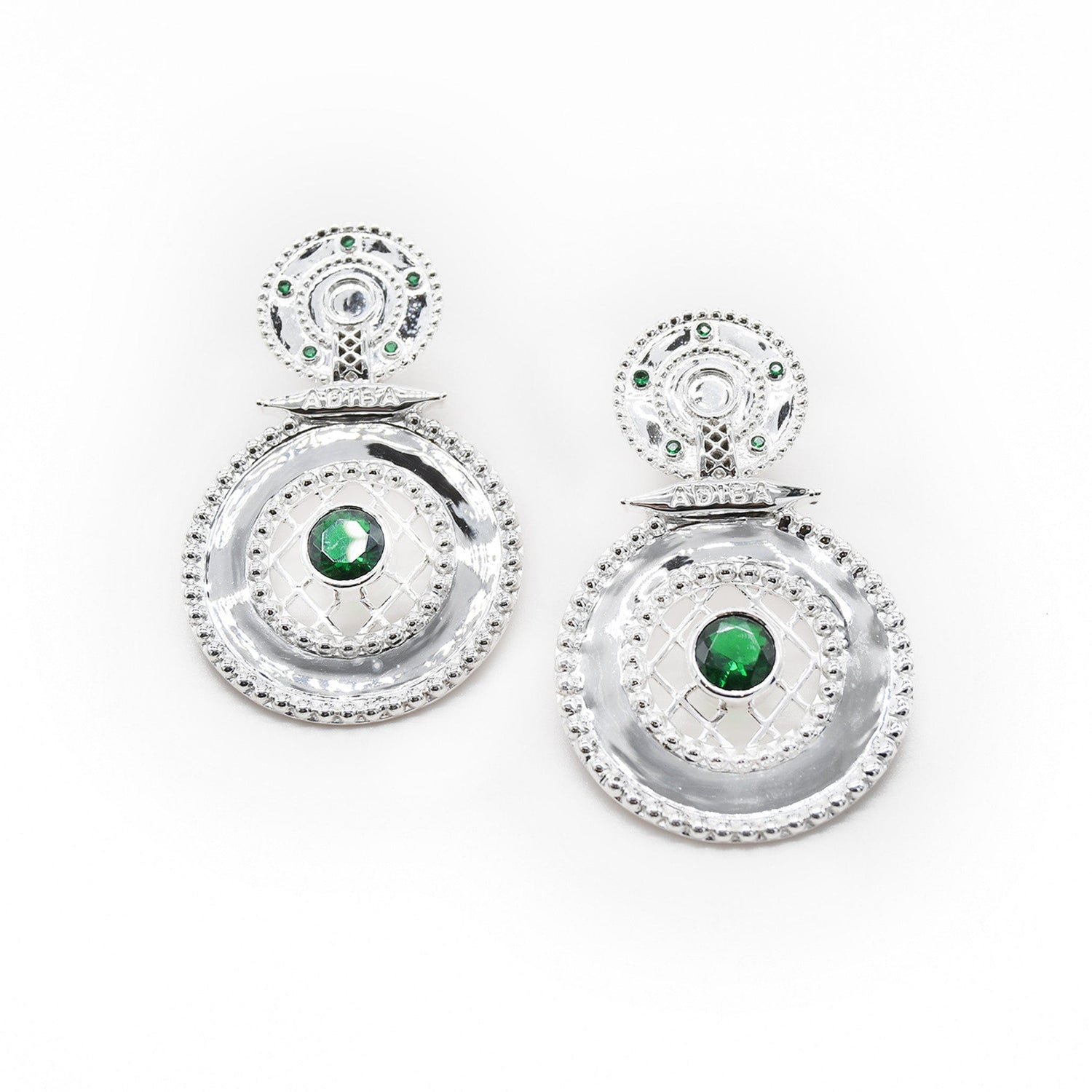 These Silver Emerald Green Adiba Earrings by Adiba offer a sophisticated look. Made with real silver and a 2.5-micron vermeil finish, they feature stunning green hydro glass stones and handcrafted details. These earrings are a beautiful statement piece that adds a touch of bold color to your style.