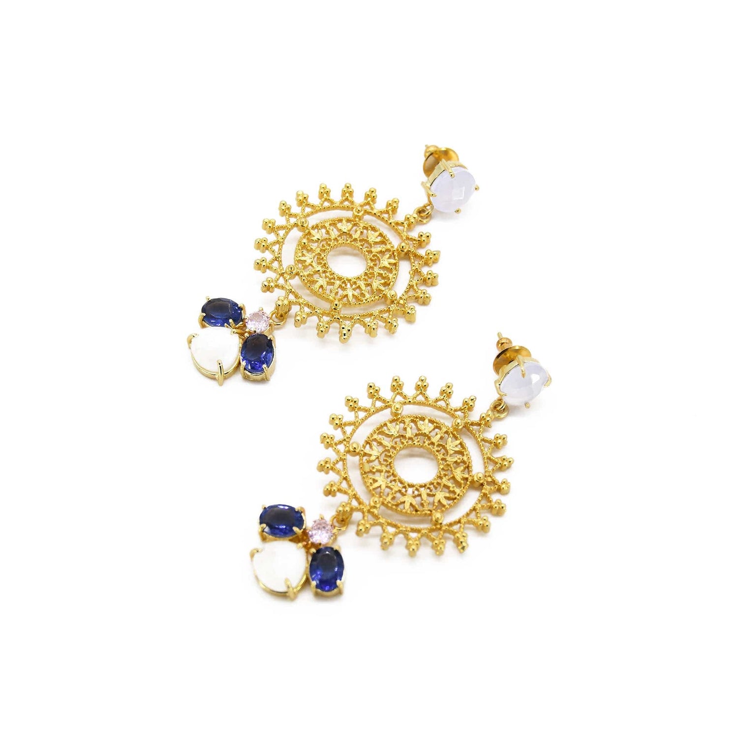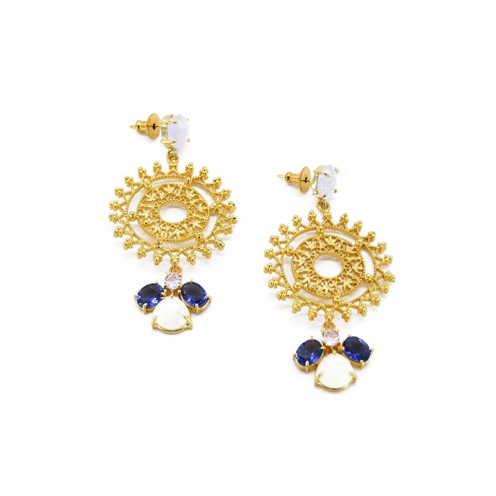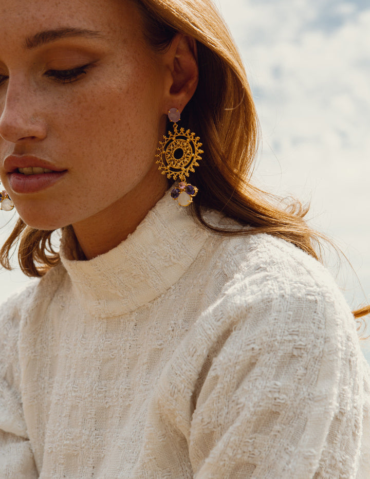 Handmade in 22k gold-plated brass. Set with lavender chalcedony, natural rainbow moonstone, amethyst, and pink zircon. Post-back closure. Nickel and lead free.