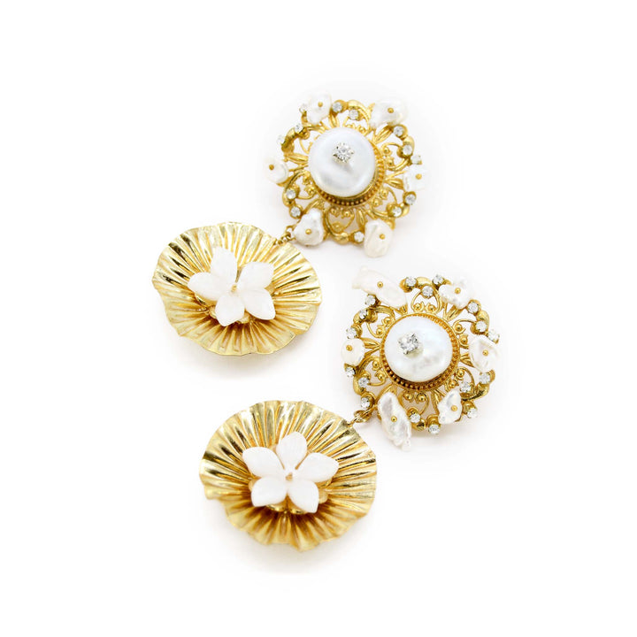 These Gardenia Handmade Drop Earrings by Adiba are inspired by the beauty of the Gardenia flower, which symbolizes purity and gentleness. They are handmade with 22k gold-plated brass and feature precious real baroque pearls and cubic zirconia studs. Due to their handmade nature, each pair has slight variations, making them unique.