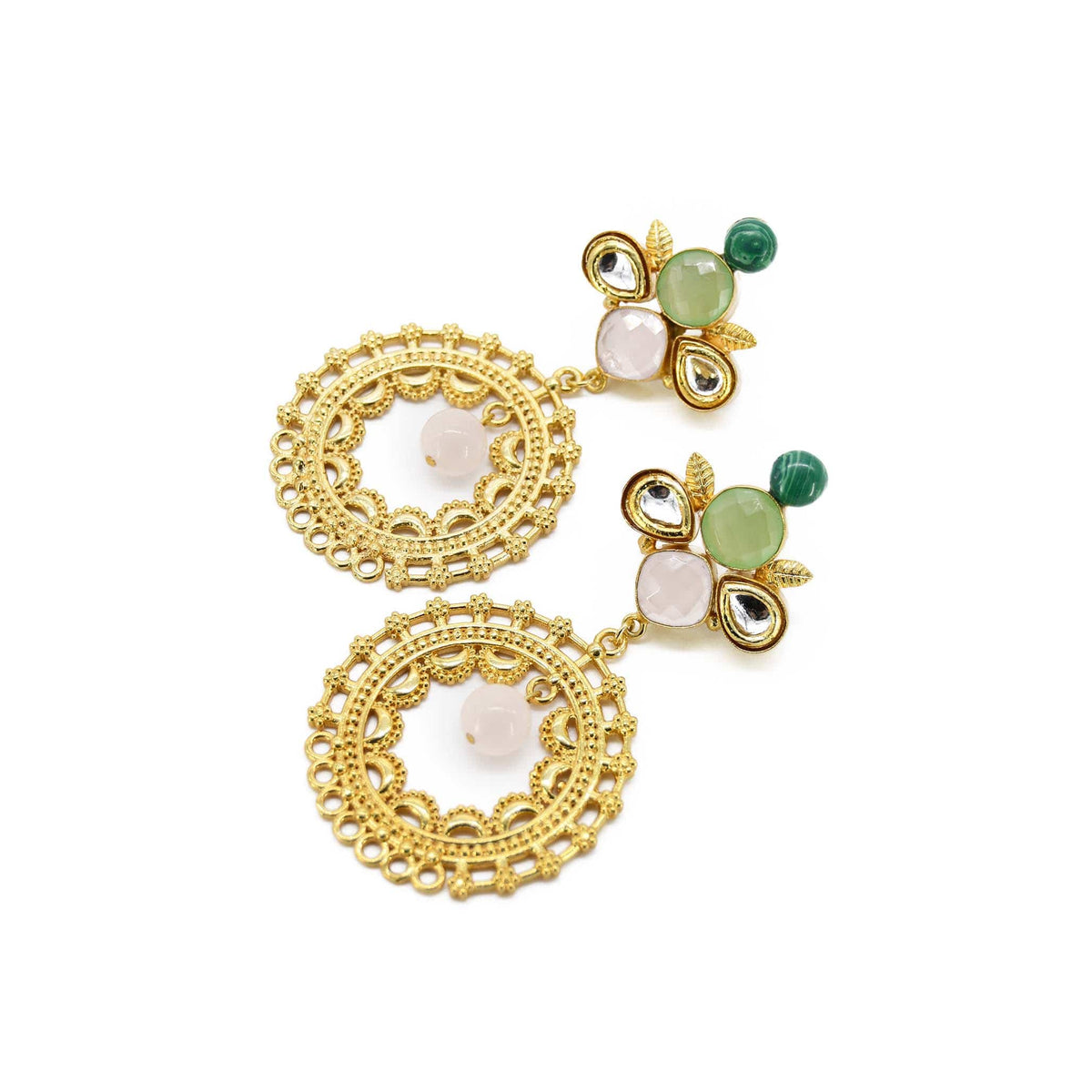 These earrings are handmade with 22k gold-plated brass and feature aqua & pink chalcedony, malachite, and rose quartz gemstones. They have a post-back design and are nickel and lead-free.