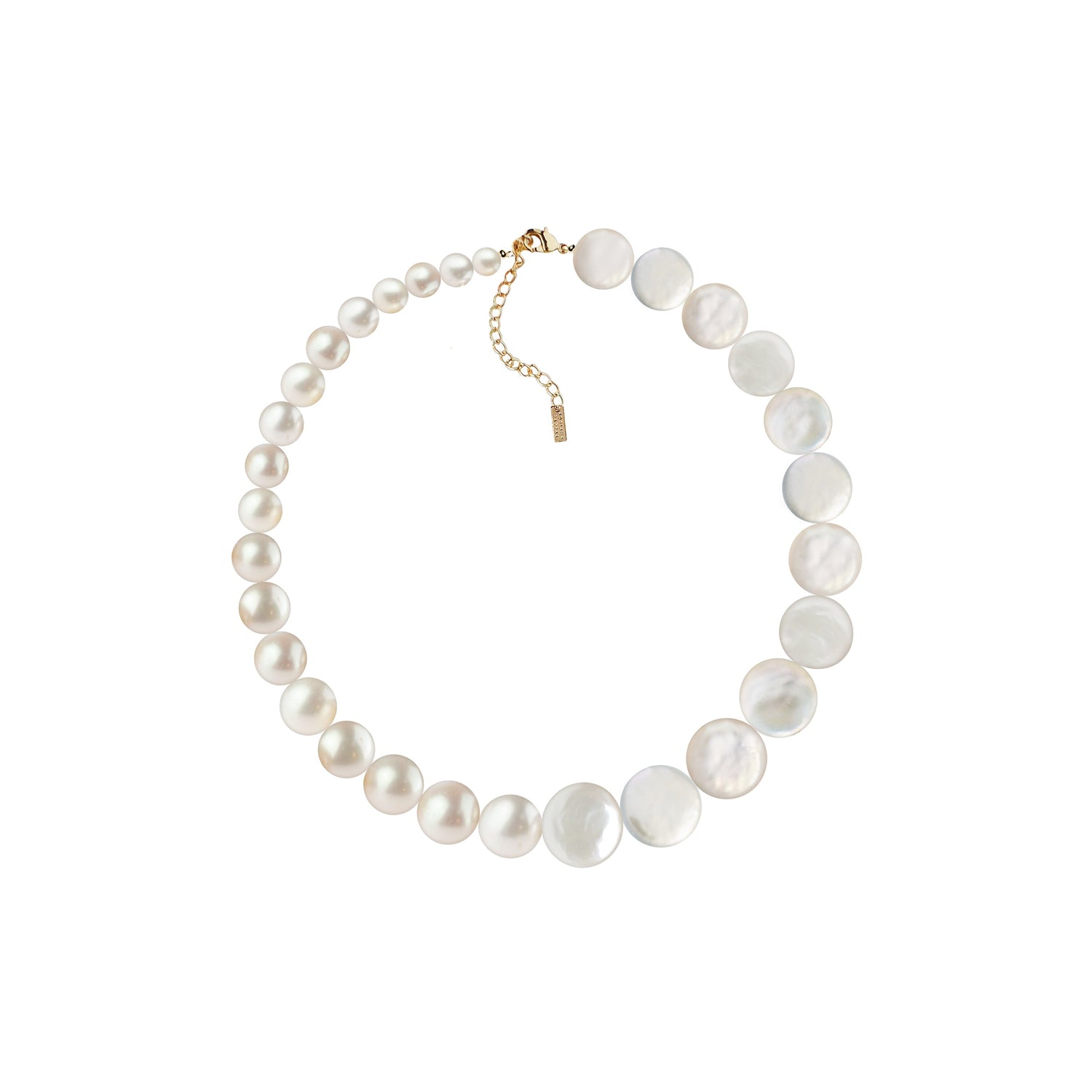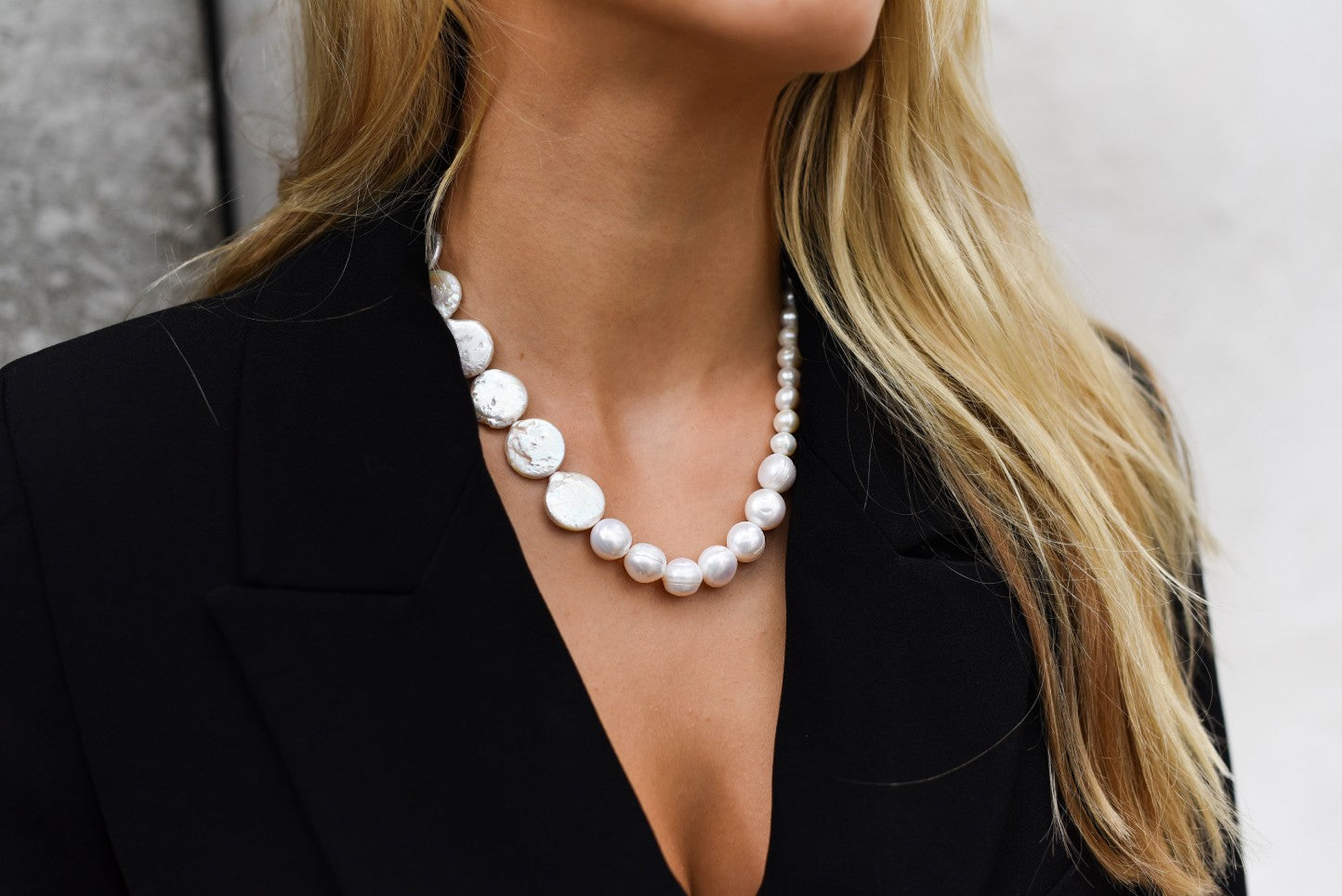 This pearl necklace is handmade from a freshwater pearl with gold-filled accents. It is approximately 16-20 inches long and is adjustable.