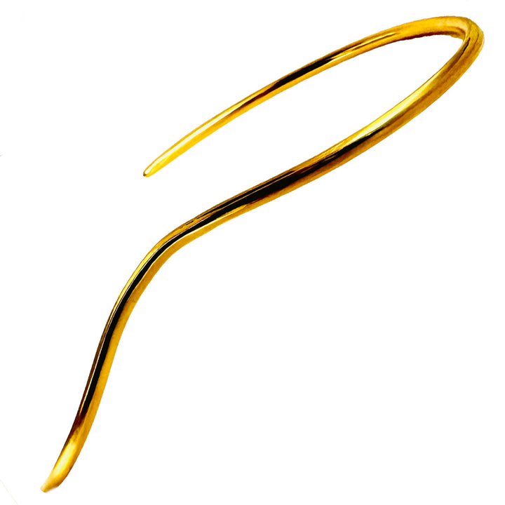 The Inca Gold Collar Necklace by Aki Roc Jewelry is an eye-catching and unique accessory. This handmade asymmetric collar necklace, with its serpent movements, is perfect for elevating your everyday style. The 18KY Gold Micron Plated on Brass finish adds a touch of luxury and makes this necklace truly one-of-a-kind.