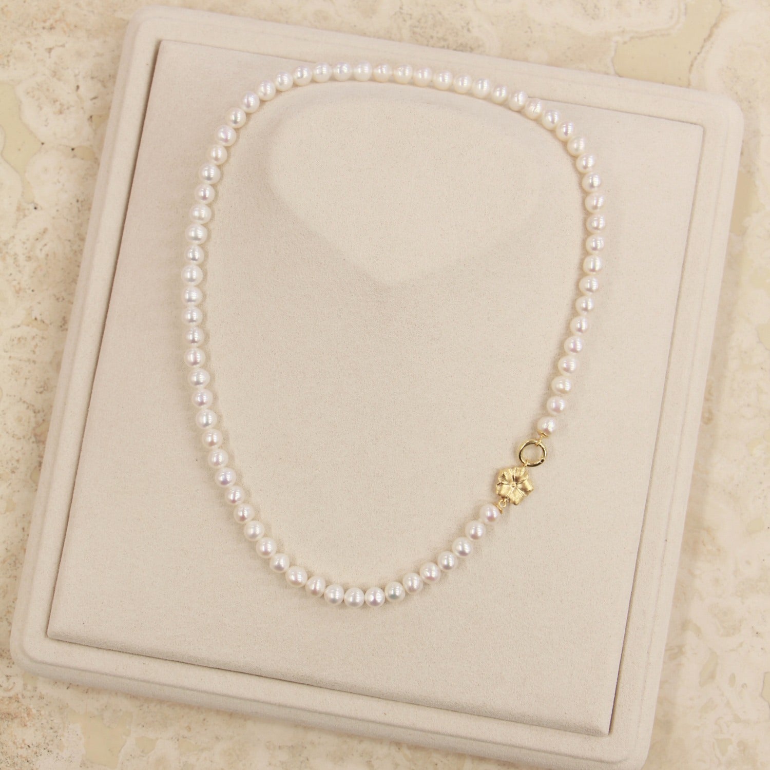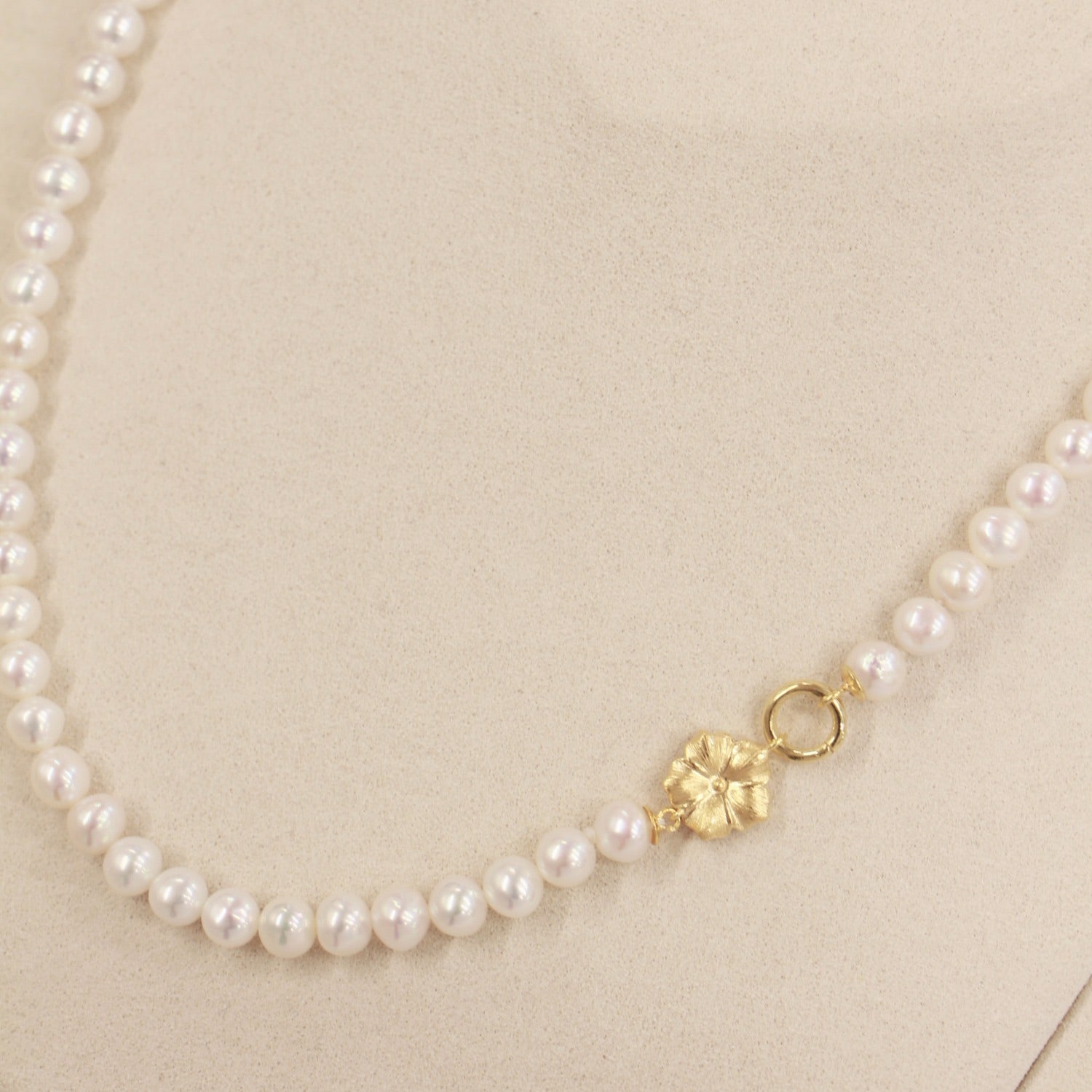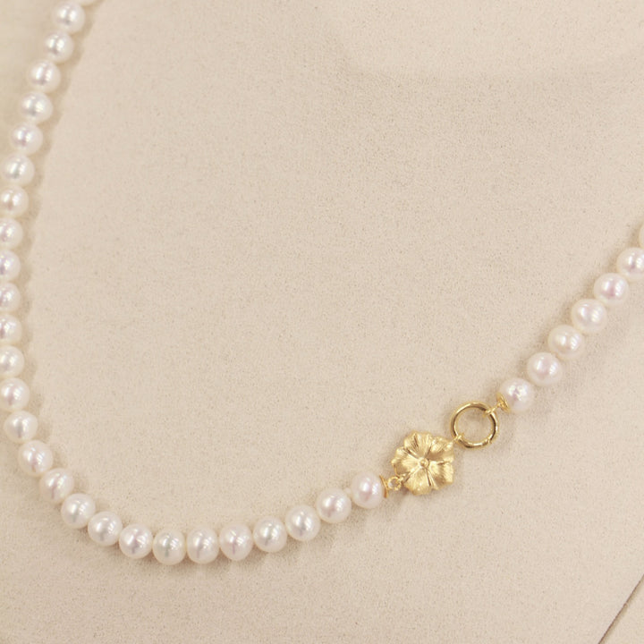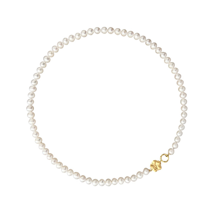 This necklace is handcrafted from 24k gold-plated 925 sterling silver. It features natural freshwater pearls and enamel.