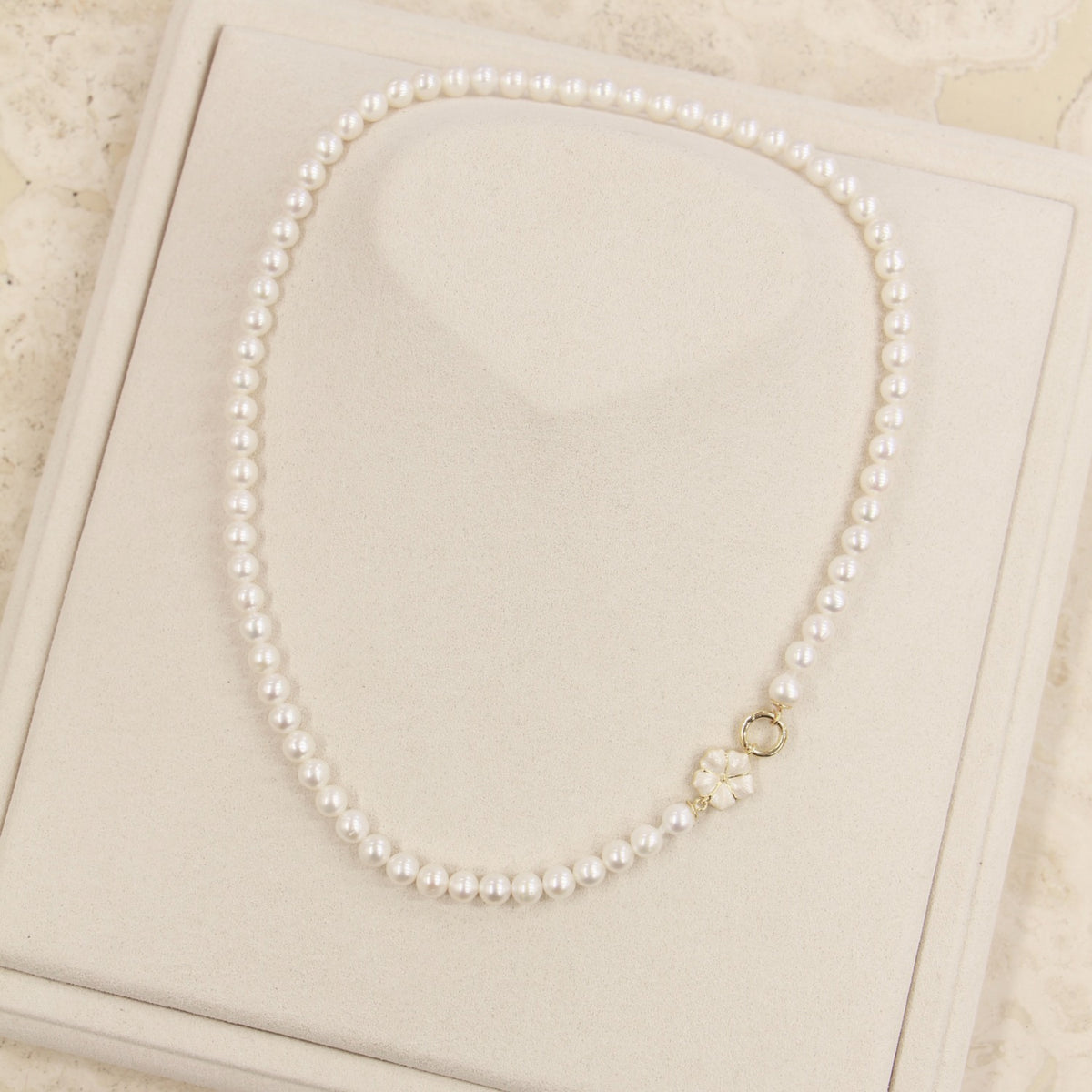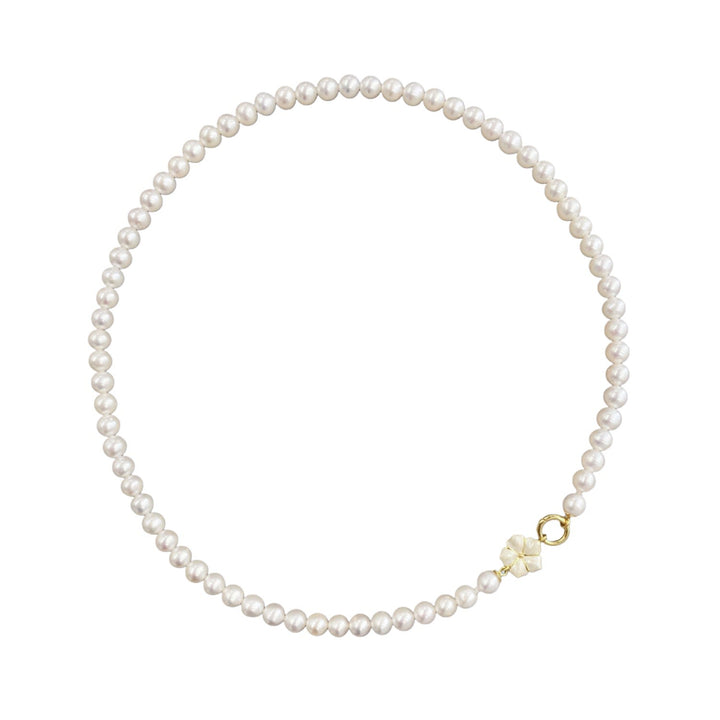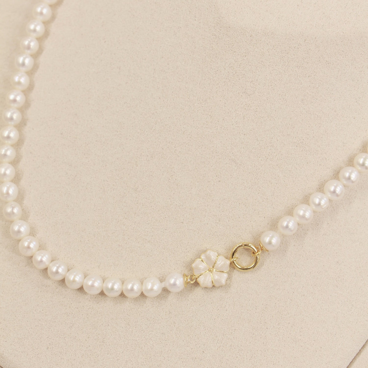 This necklace is handcrafted from 24k gold-plated 925 sterling silver. It features natural freshwater pearls and enamel.