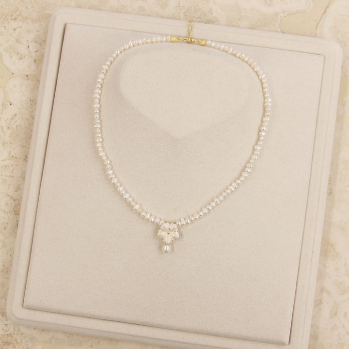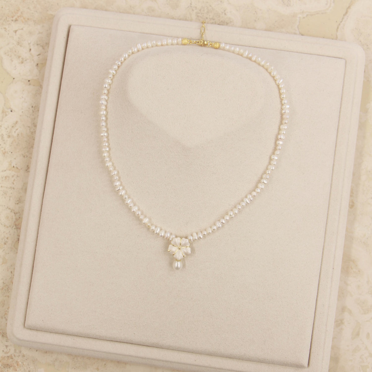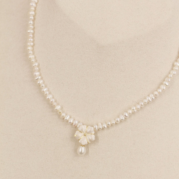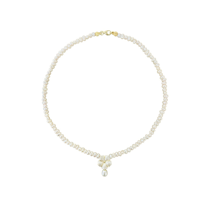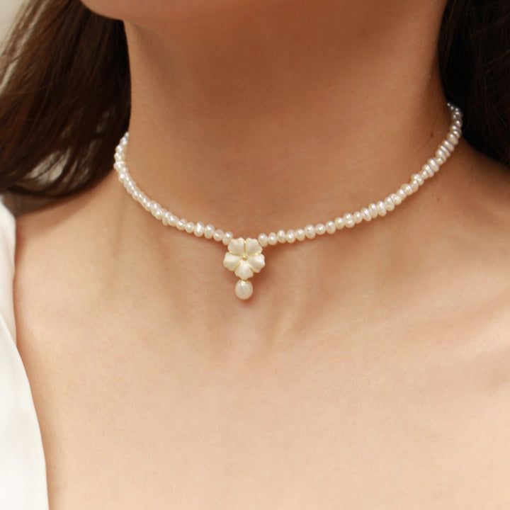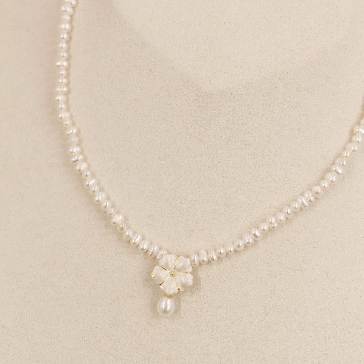 This choker is made with natural freshwater pearls, enamel, and 24K gold-plated 925 sterling silver. The length is 35+5 cm.