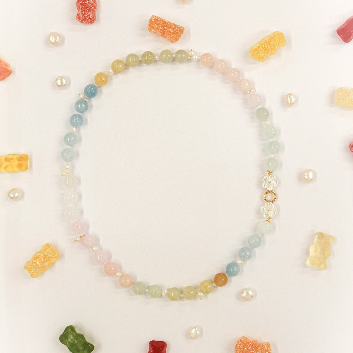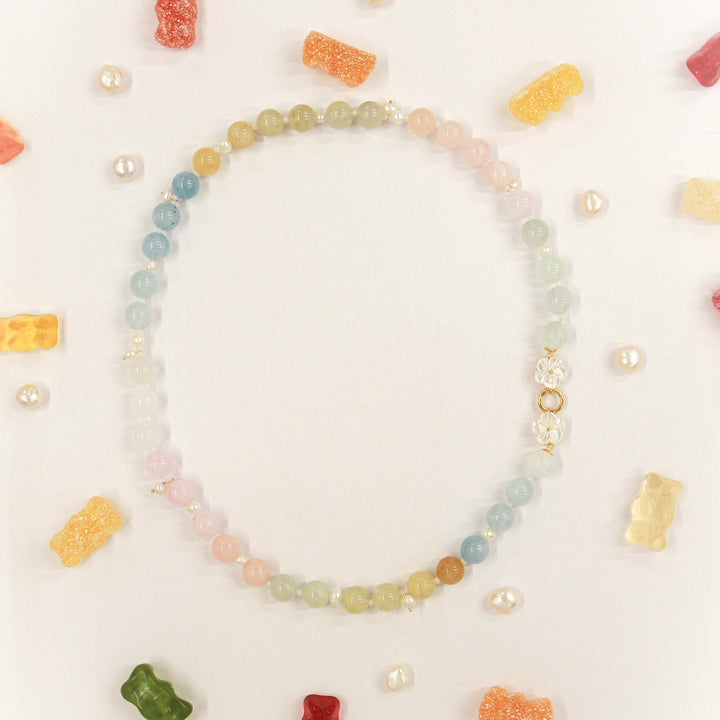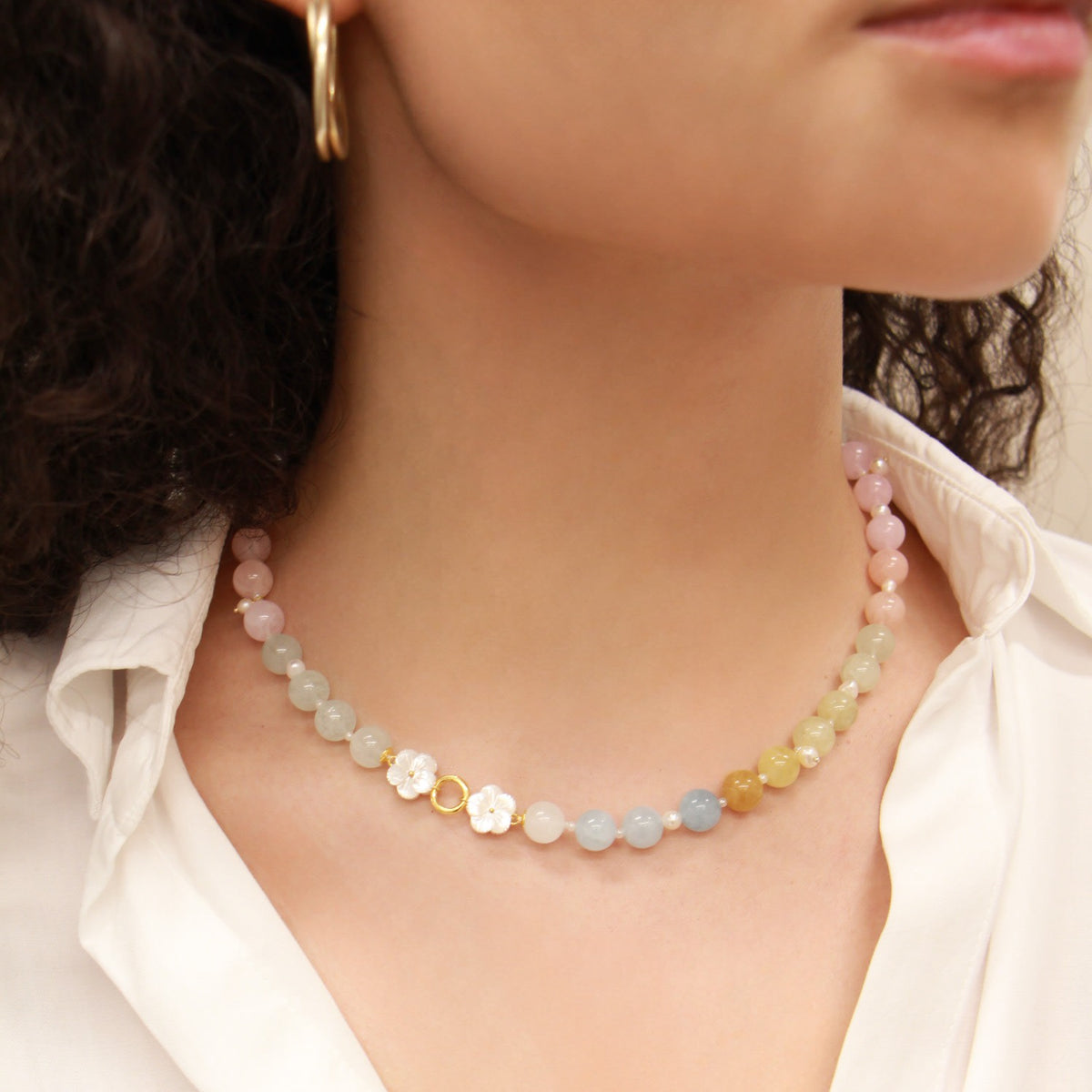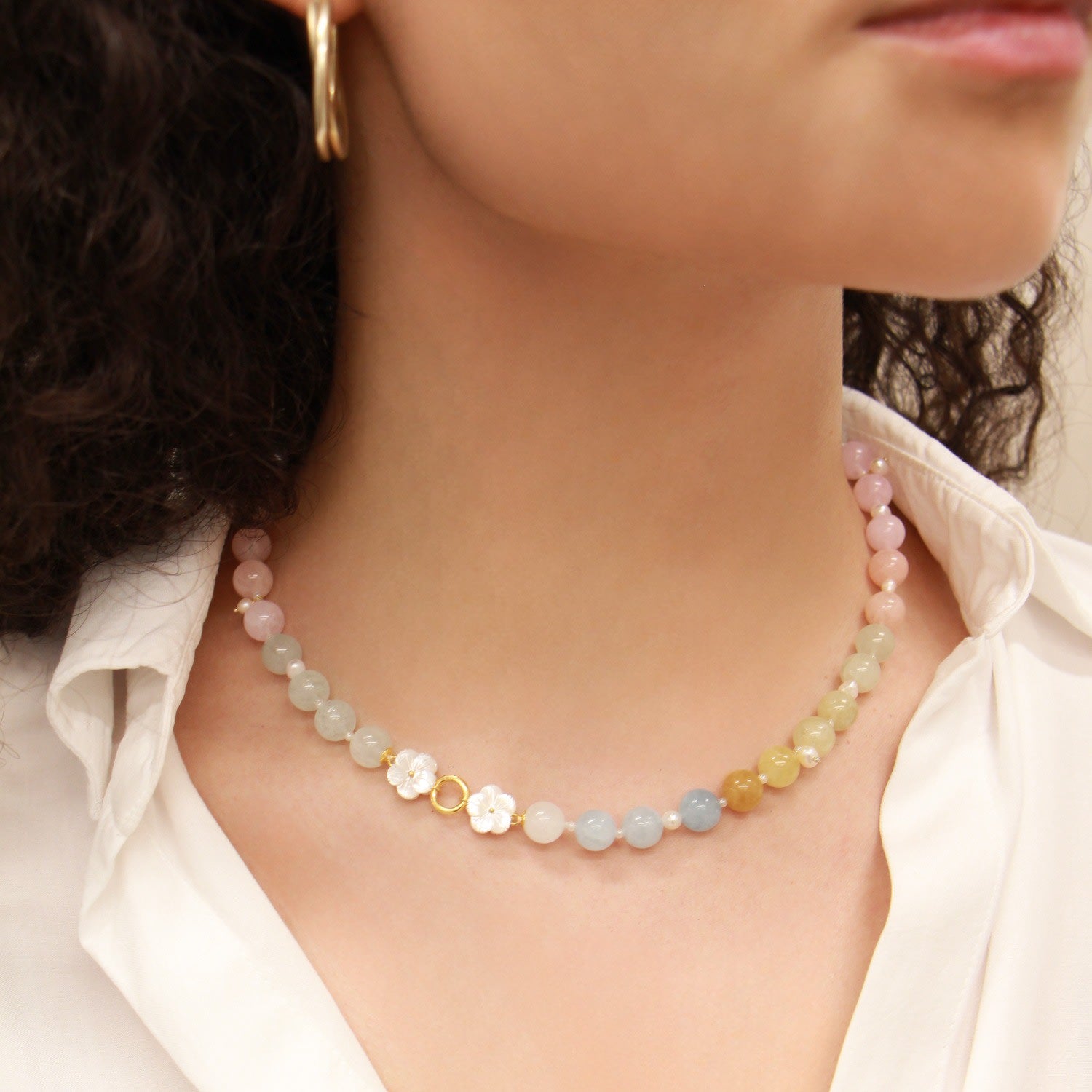 The Cleito Bonbon Necklace by Alegoria Jewellery is inspired by the myth of Poseidon's eternal love for Cleito. This handcrafted necklace combines timeless pearls, a delicate mother-of-pearl flower, and a natural morganite stone, reminiscent of the endless beauty of the ocean. It's a delicate and elegant piece perfect for honoring love and nature.