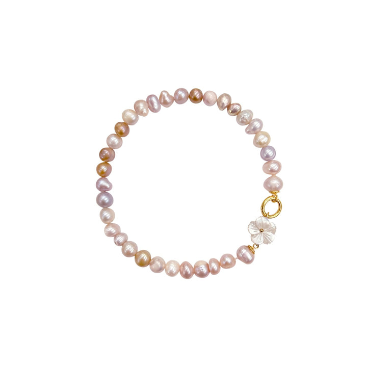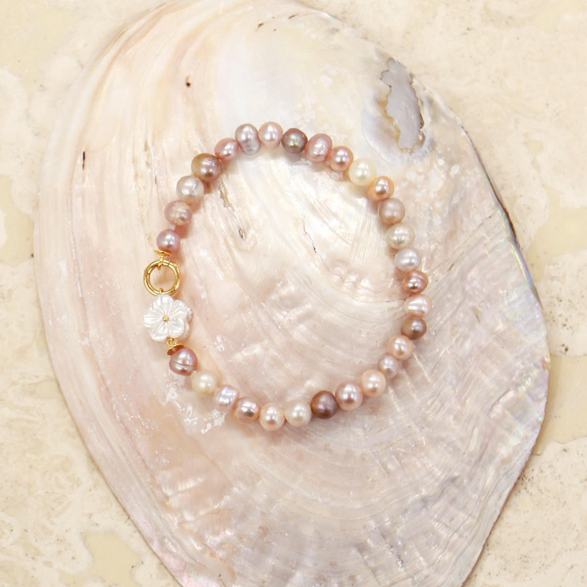 The Cleito Bracelet by Alegoria Jewellery is a beautiful and timeless piece inspired by the mythical garden of Cleito. It combines classic natural freshwater pearls with colorful mother-of-pearl and natural stones, intricately carved with elegant floral designs. It is a handcrafted piece that reflects traditional craftsmanship and timeless elegance.