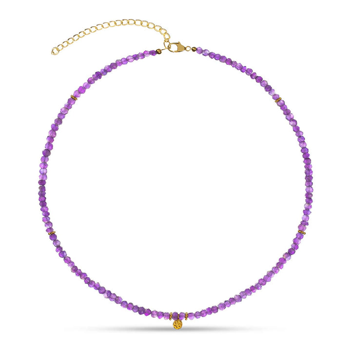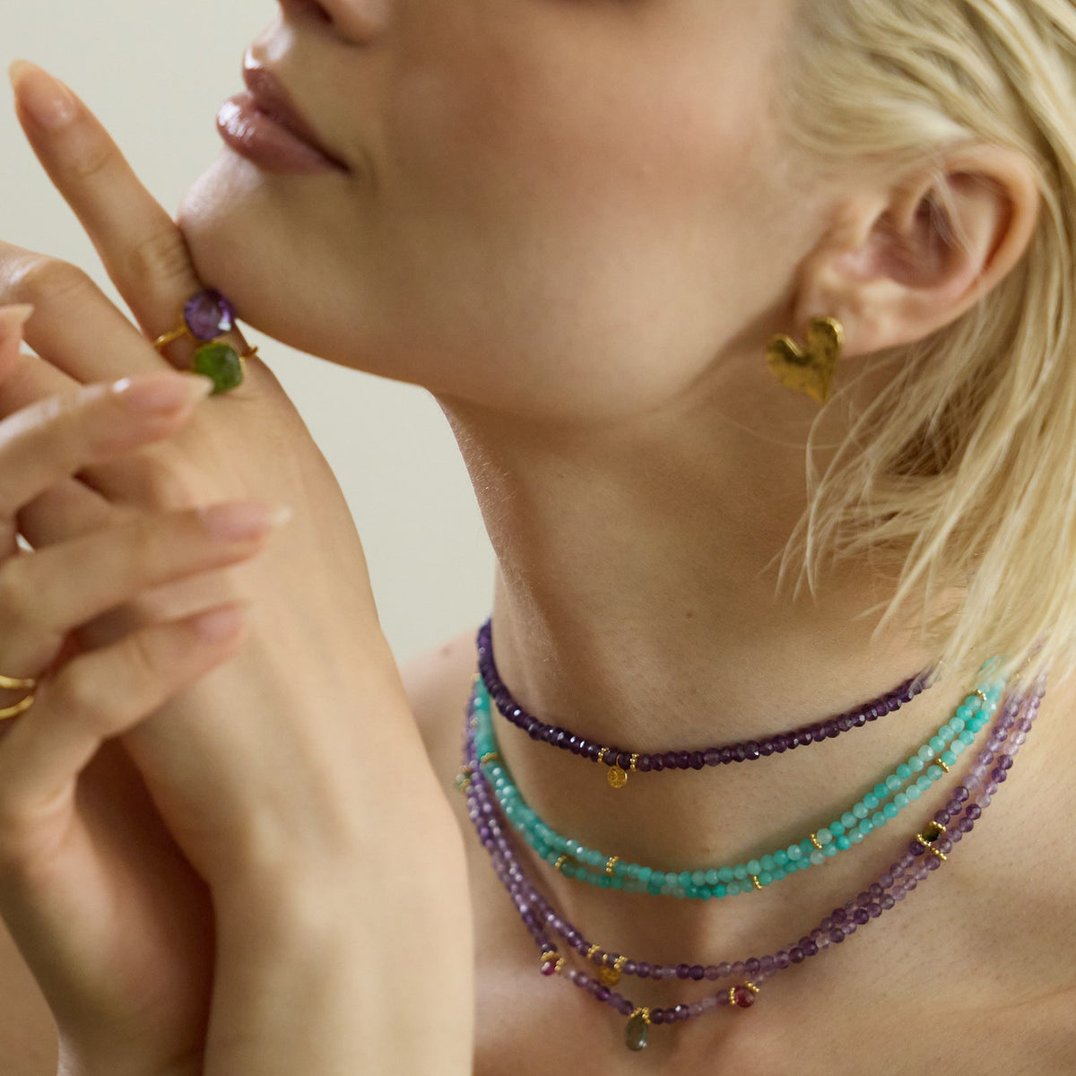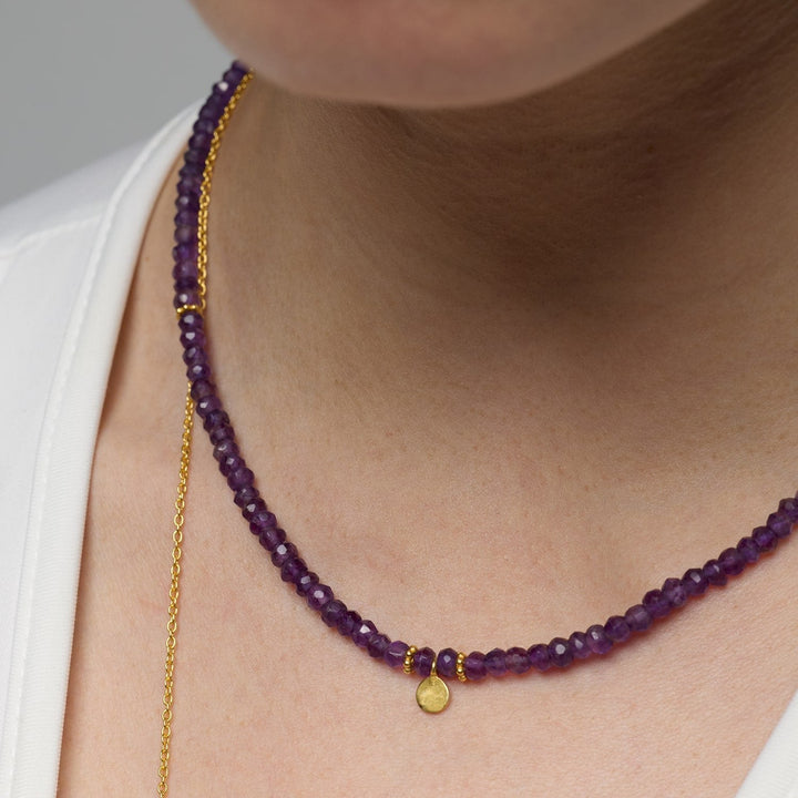 This beaded necklace is handmade with vintage amethyst gemstones and sustainable 18k gold vermeil.