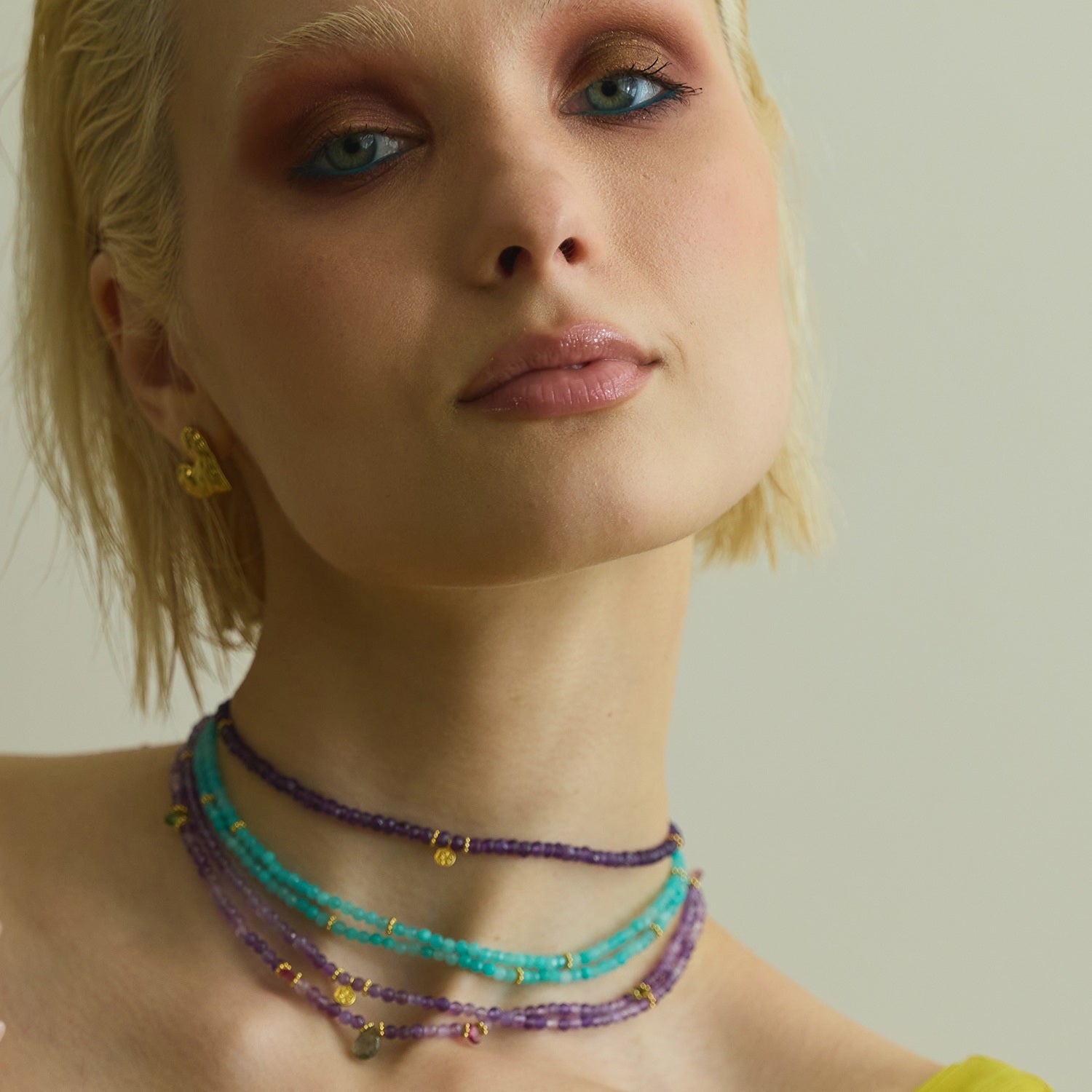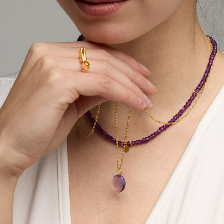 This Ines Amethyst Necklace by Amadeus is a stunning and sustainable accessory. This beaded necklace is handmade with vintage amethyst gemstones and a sustainable 18k gold vermeil round charm and findings.