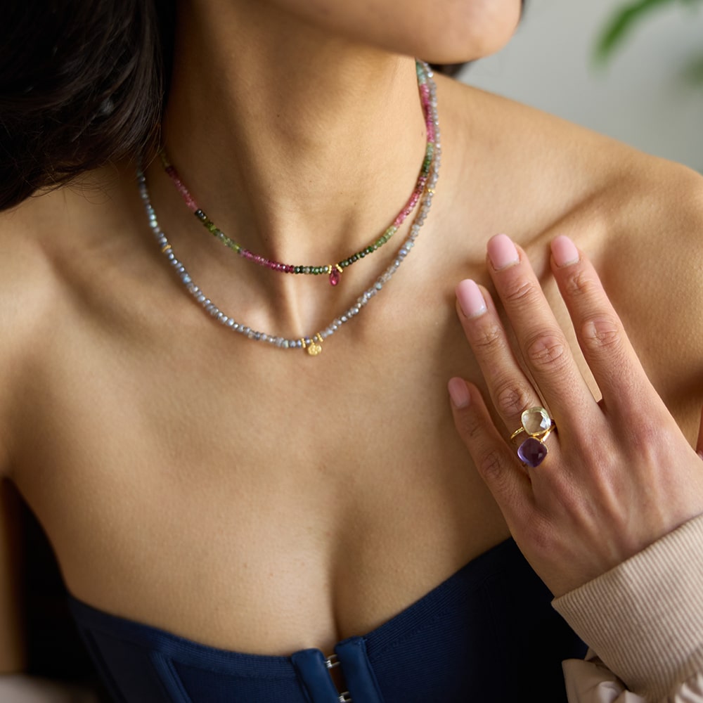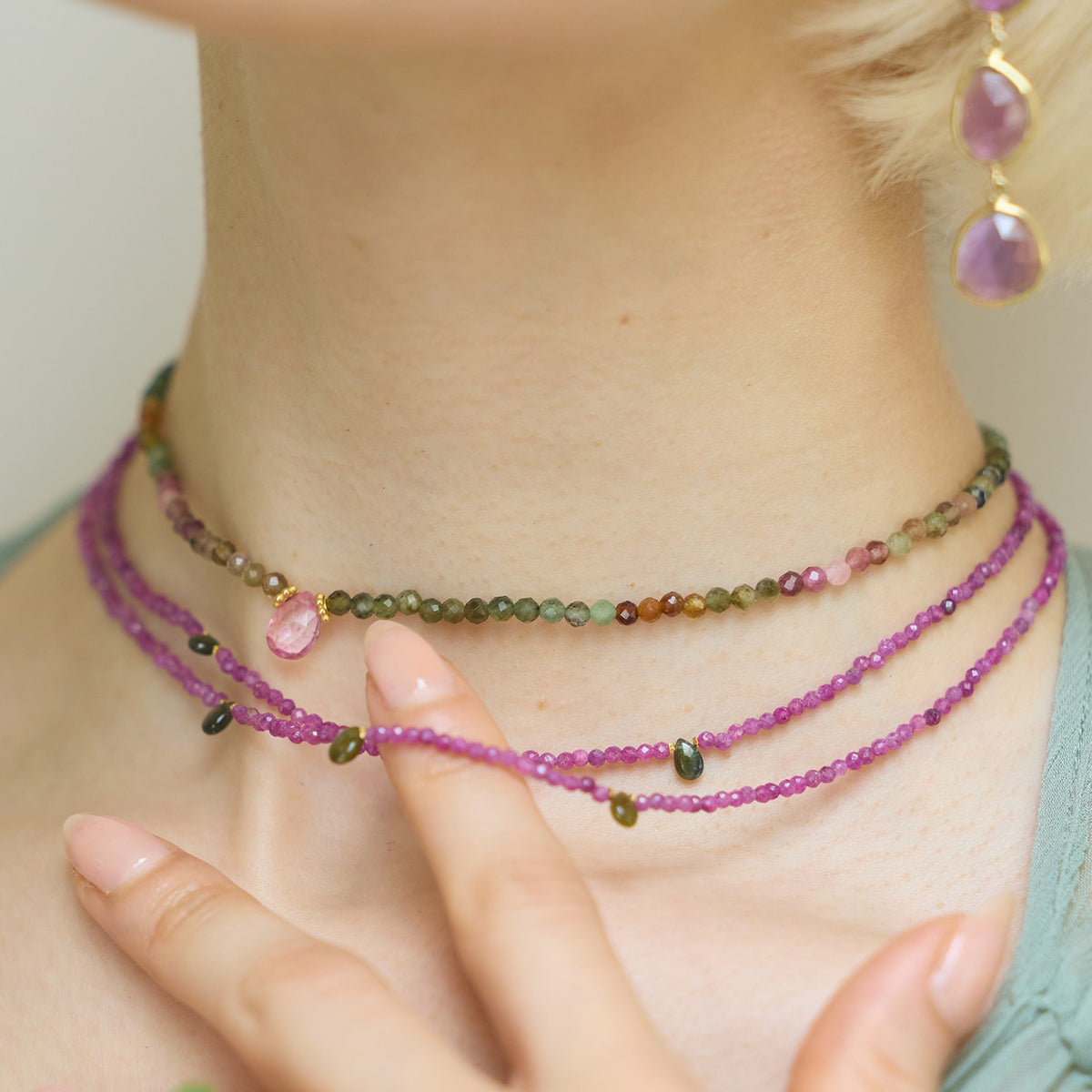 This necklace is made from 100% recycled tourmaline gemstones and 18k gold vermeil.