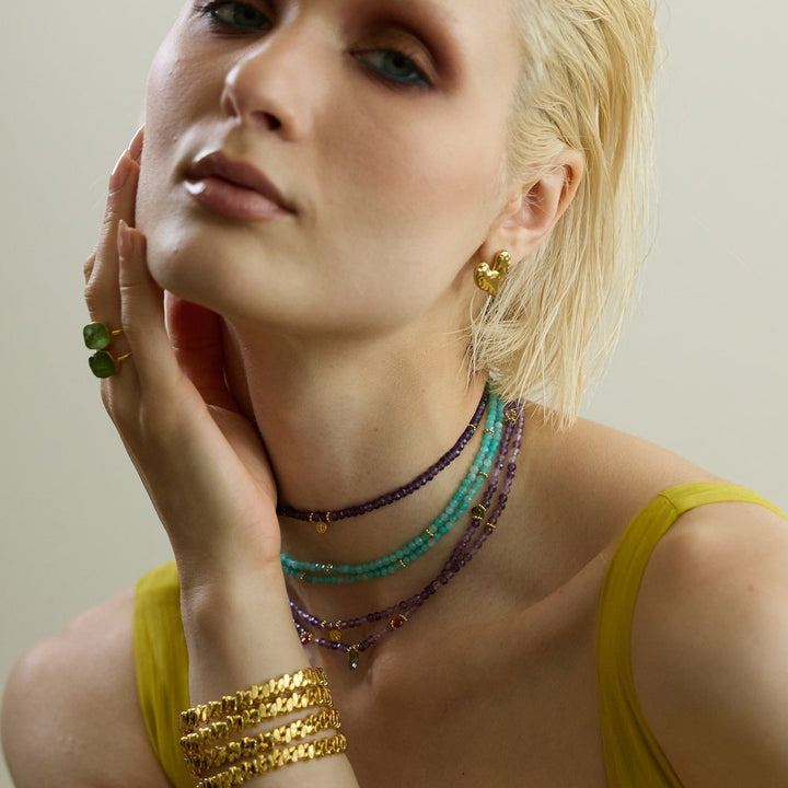 This Ines Amazonite Gemstone Necklace by Amadeus is a sustainable and impactful accessory. Handcrafted with vintage amazonite gemstones on an adjustable recycled gold vermeil chain, this necklace is designed to be a low-maintenance, high-impact piece. It's best worn stacked with other necklaces to create a personalized look.