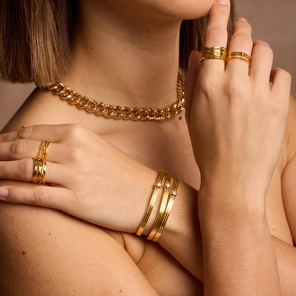 This Athena Gold Cuff Bracelet With Sparkles by Amadeus is a sleek and timeless piece, perfect for stacking. This cuff is handmade with pre-loved cubic zirconia gemstones and recycled 18k gold vermeil, giving it a luxurious sparkle with a sustainable story. It’s an ideal accessory for adding a touch of glamour to your look.