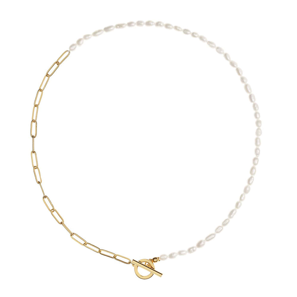 The Alba Mixed White Pearls & Gold Chain Necklace by Amadeus is a perfect layering necklace with a unique half-and-half design. It features a mix of gold chain and pre-loved white pearls, with a toggle clasp in the front. This sustainable and stylish piece sits on the upper neck.