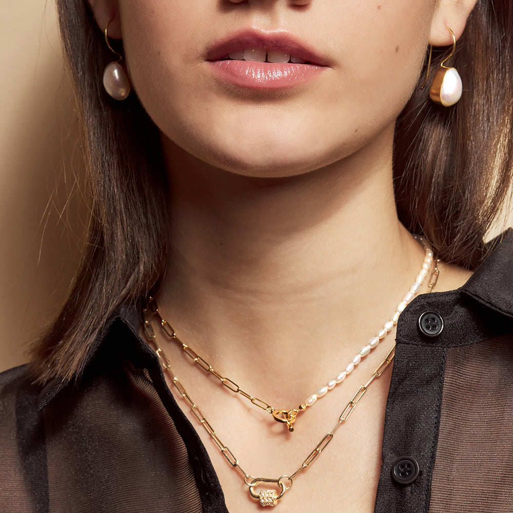 This necklace is made from recycled brass with thick layers of recycled 14-carat gold plating. The white pearls are pre-loved and sourced from a vintage jewelry piece.