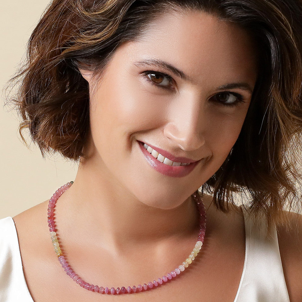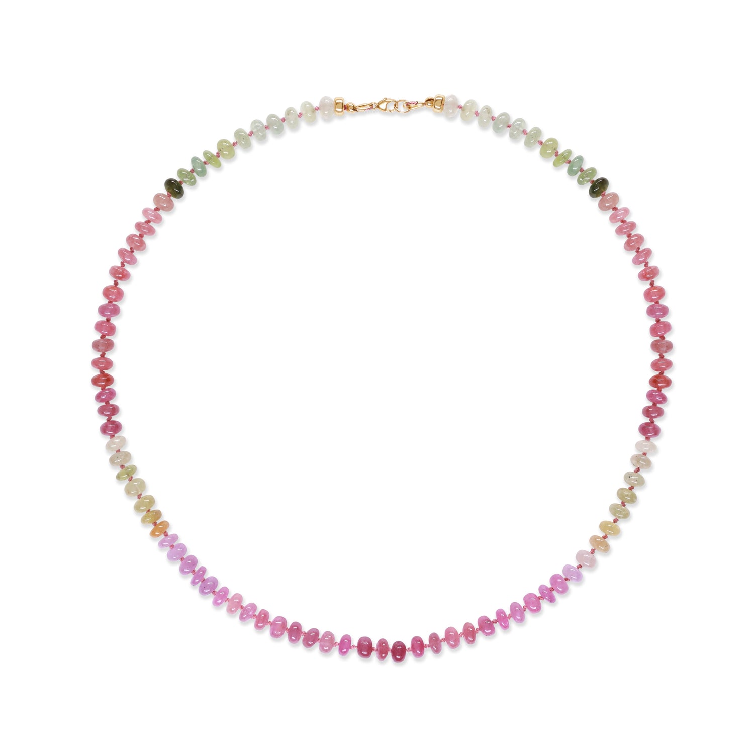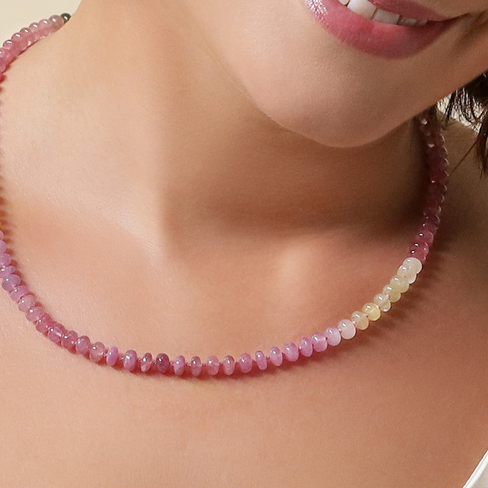 This beaded necklace is made with rare, high-quality sapphires in red, pink, and yellow. The product does not specify the metal type used.