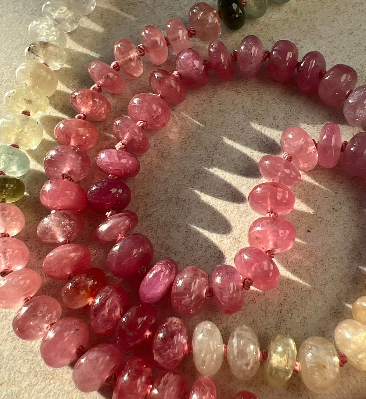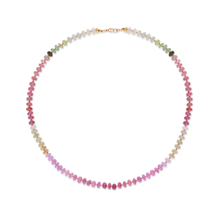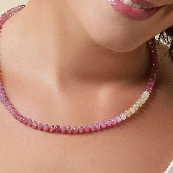The Smooth Sapphire Necklace by Amelia Roxanna Jewellery is a truly one-of-a-kind piece. It features a rare and exquisite blend of high-quality red, pink, and yellow sapphires. This vibrant beaded necklace is a bold statement piece that showcases unmatched beauty and can elevate your style on any occasion.