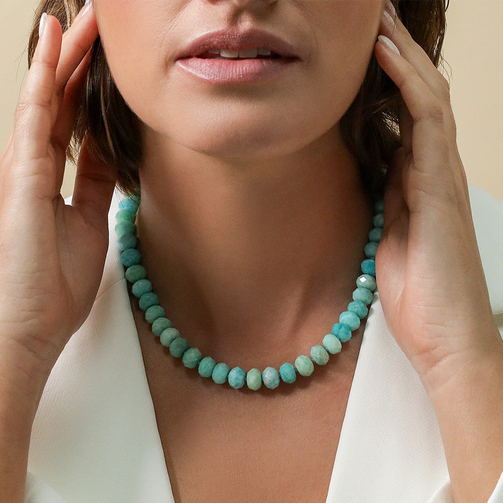 This necklace is crafted with chunky faceted amazonite beads. The length is 16 inches.