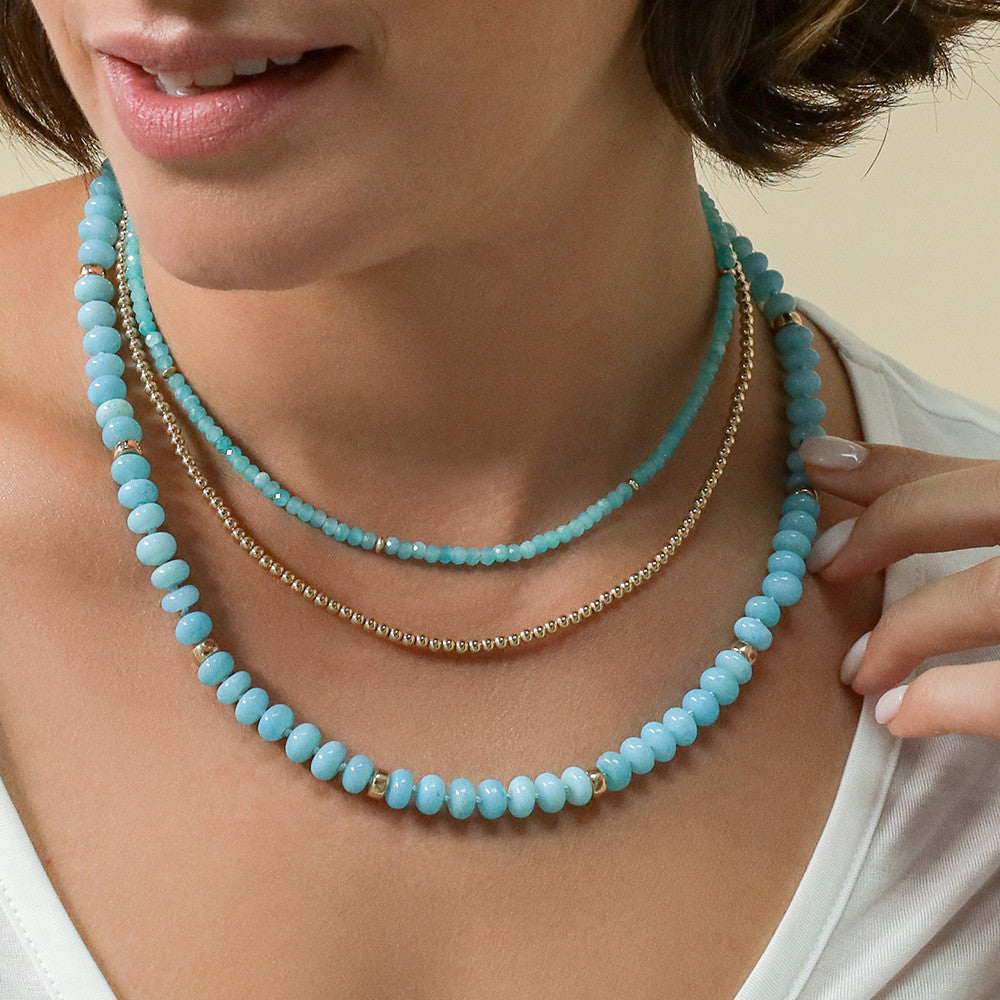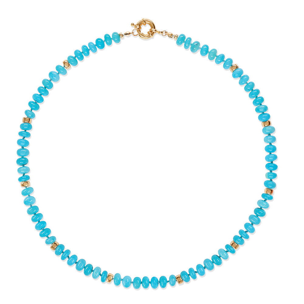 This necklace is hand-knotted on silk and features aqua blue opal beads and gold rondelle beads.