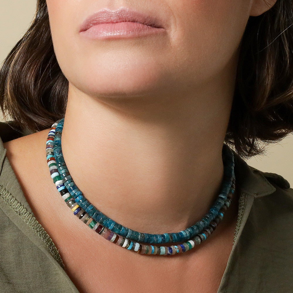 This necklace is crafted with multi-gemstone faceted heishi stones, gold accent beads, and a gold-filled clasp.