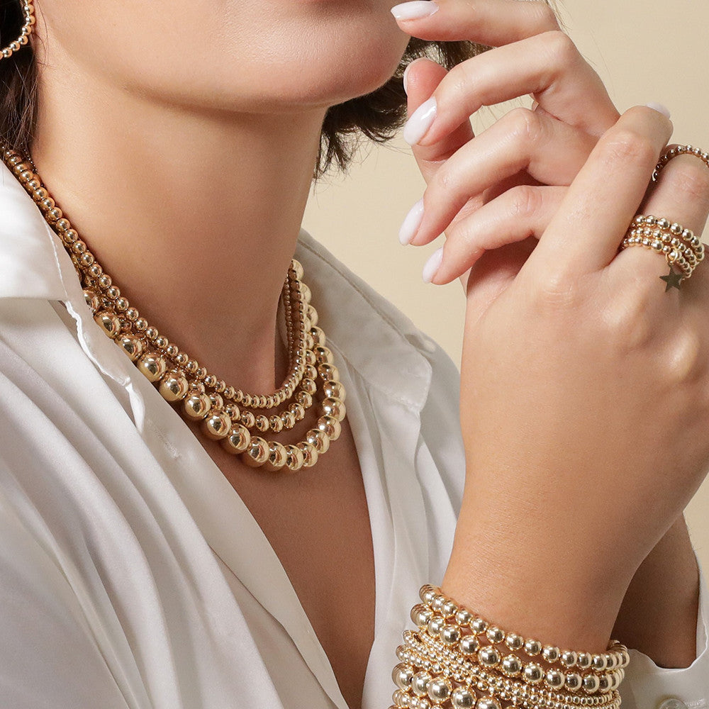 The Classics Twist Gold Bead Necklace by Amelia Roxanna Jewellery is the epitome of simple elegance. This beaded necklace features tarnish-resistant gold-filled beads that are 8mm and 3mm in size. With a 15-inch length and a 2-inch extension, it is perfect for layering or wearing alone. The gold-filled material provides the appearance and quality of solid gold at an affordable price.