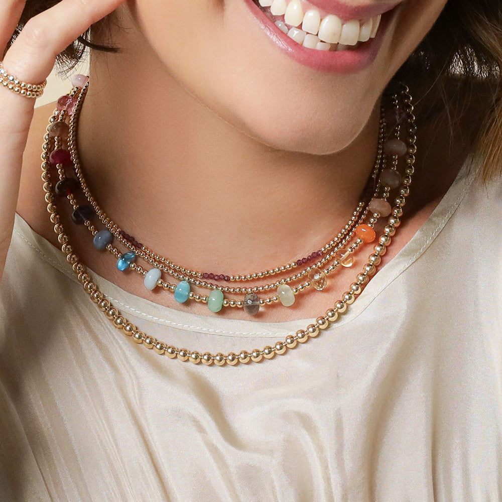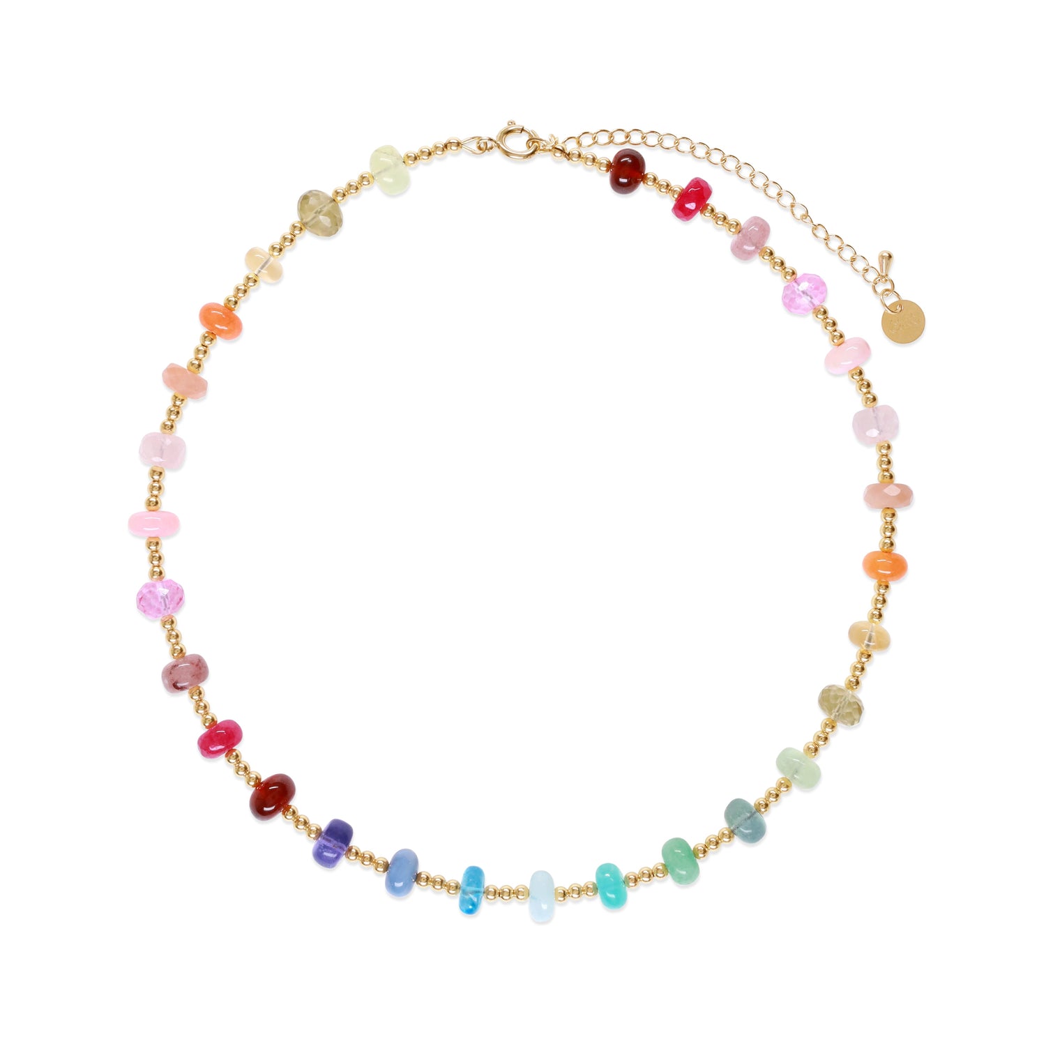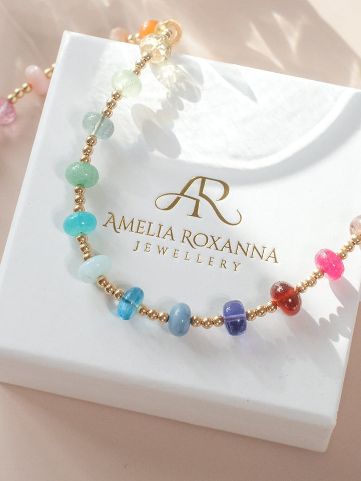 The Golden Rainbow Fusion Necklace by Amelia Roxanna Jewellery is a gold filled beaded necklace that features a fusion of stacked gold beads and a variety of rainbow gemstones. The necklace is 16 inches long with a 2-inch extension. This piece can be worn solo or layered, offering a boho glam vibe with the added benefit of healing energy from the gemstones.
