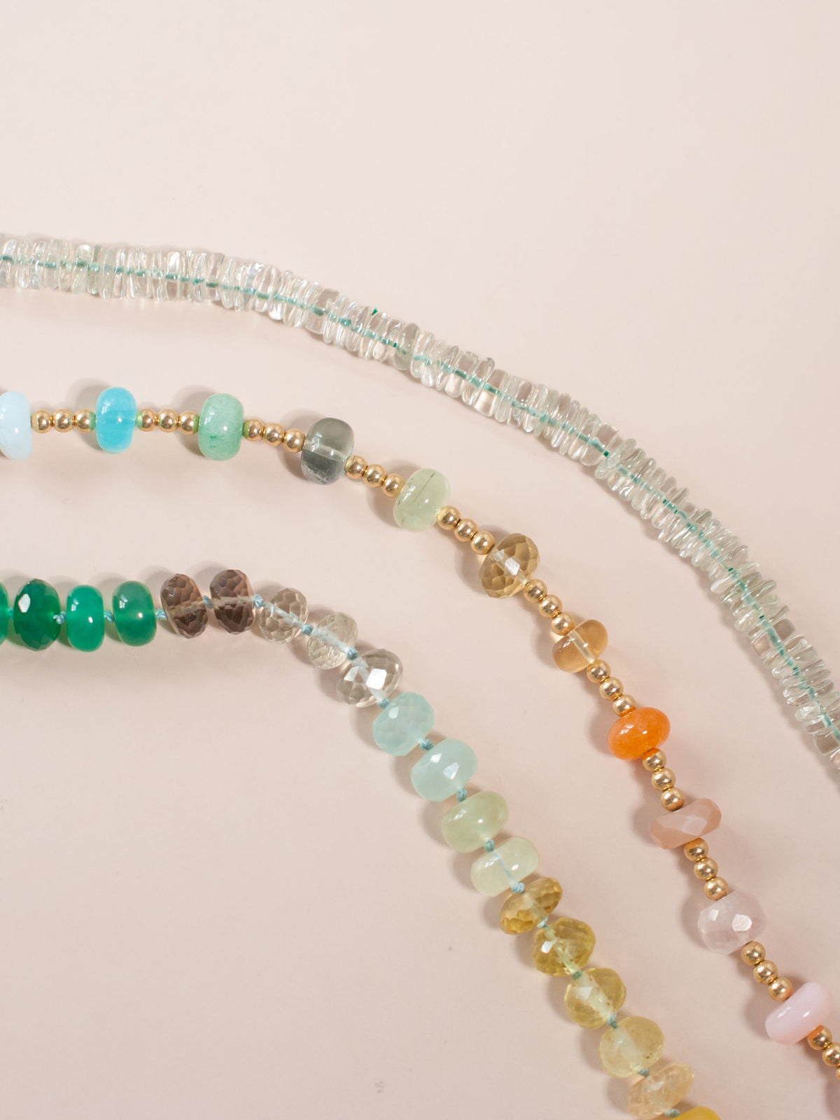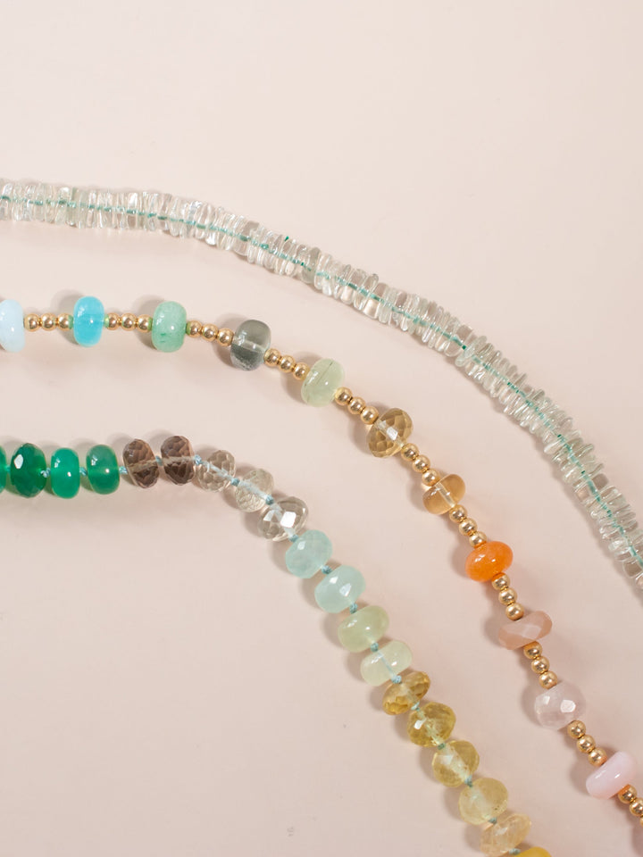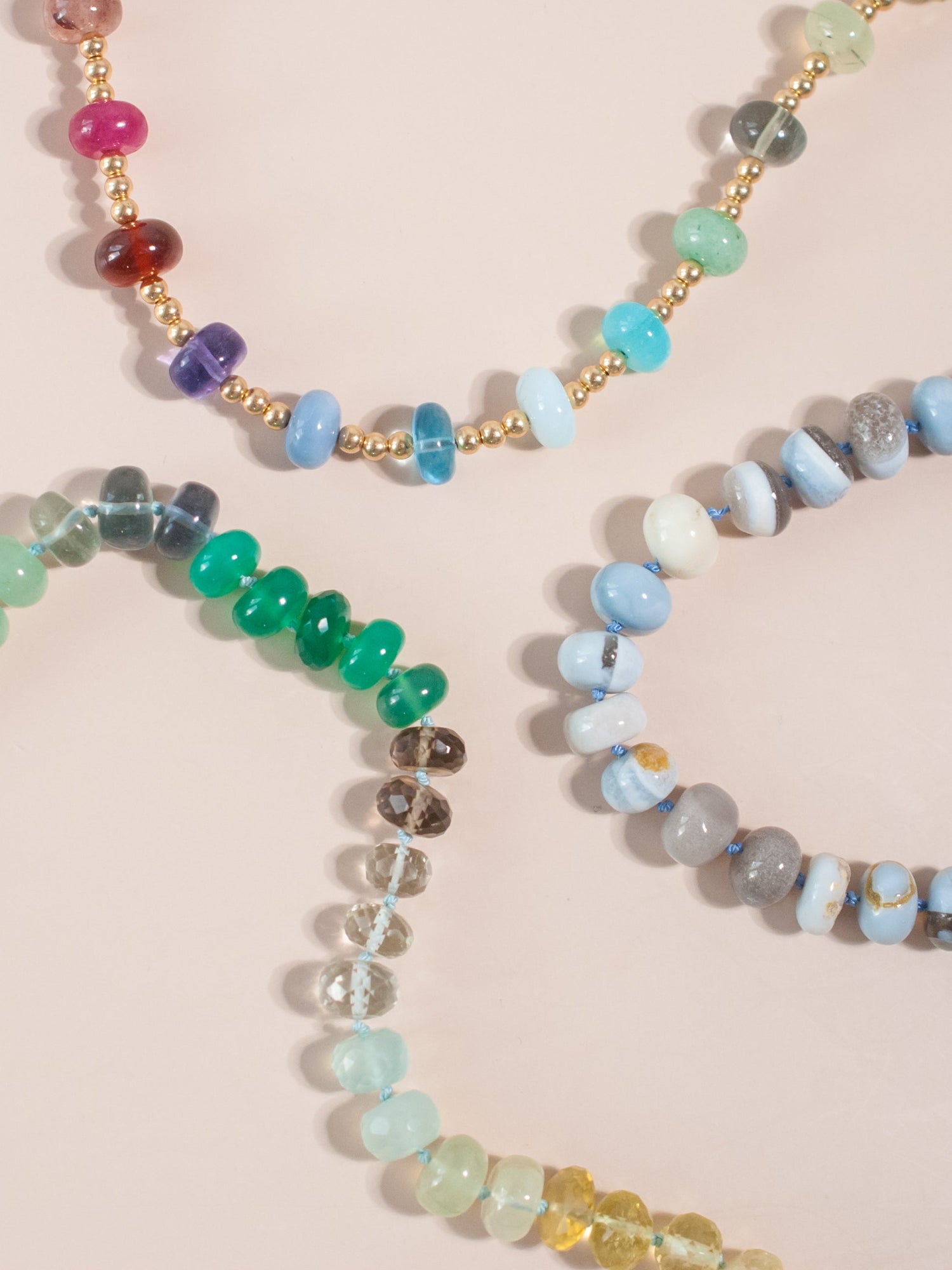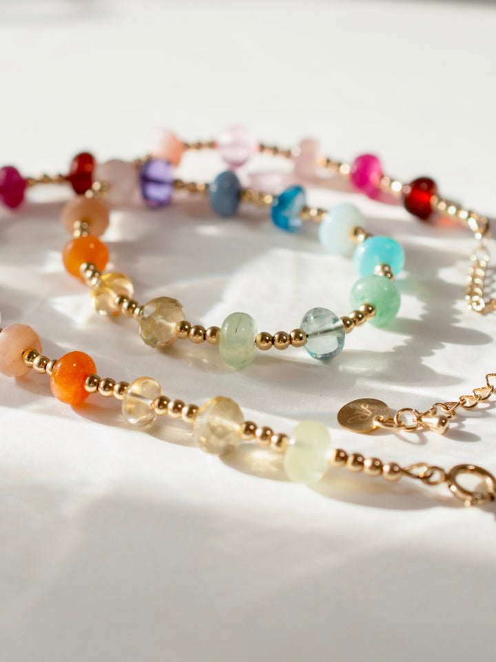 This beaded necklace is made from a gold filled base with a variety of rainbow gemstones, including blue topaz, pink topaz, prehnite, citrine, amethyst, and opals.