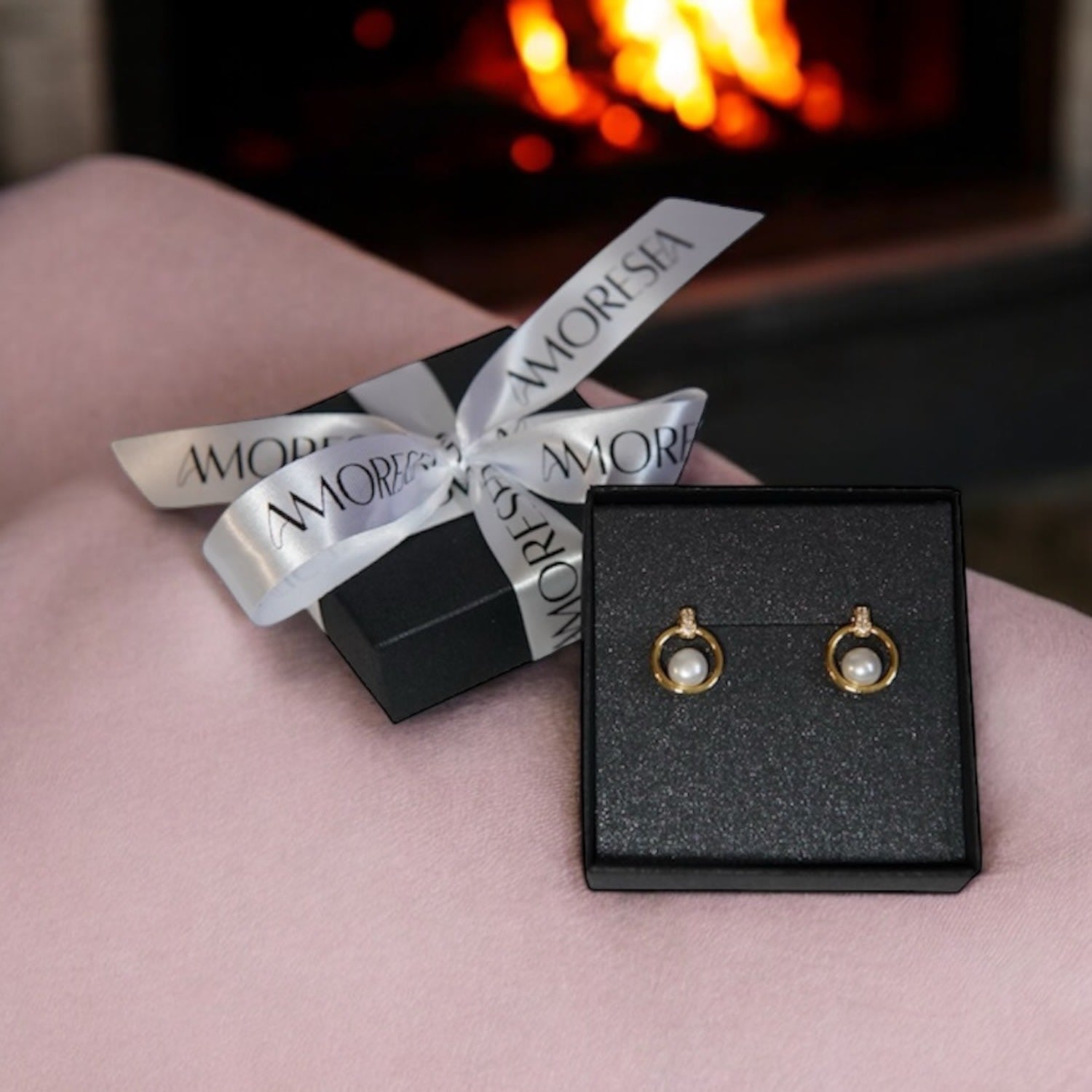 These Gorgeous Freshwater Pearl Zircon Round Ear Studs by Amoresea are a perfect blend of classic and contemporary elegance. A luminous freshwater pearl is gracefully suspended within a polished gold-plated open circle, with a bar of sparkling crystals above it. This unique design adds a modern flair to the timeless appeal of pearls, making them ideal for both casual and formal outfits.
