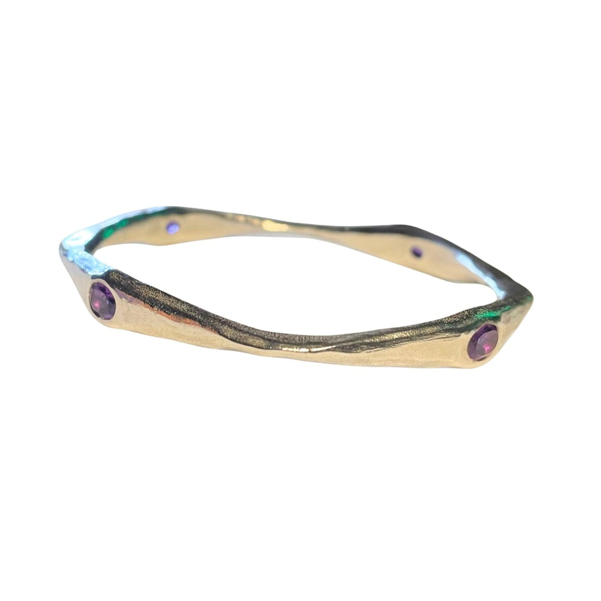 This Brooke - Amethyst Four Stone Silver Bangle Bracelet by Amy Delson Jewelry is a unique and sparkling accessory. The undulating form of the bangle, with four amethyst stones, makes it easy to stack with itself. The amethyst is known for calming and relieving stress, adding a meaningful and personal touch to the bangle. This piece is a beautiful blend of style and positive energy.
