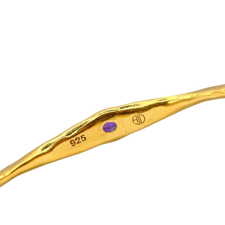 This bangle is made from 18k gold vermeil over sterling silver. It features four 7mm x 5mm genuine amethyst gemstones. It is one-size-fits-most and is made in NYC.
