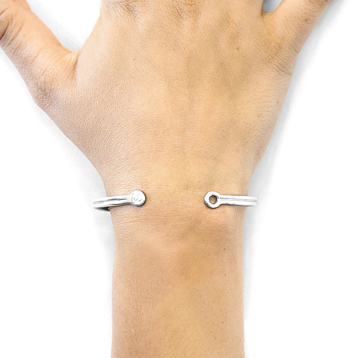 This Bartlett Inline Midi Geometric Silver Bangle by Anchor & Crew is a modern and minimalist accessory. Designed and handcrafted in Great Britain, this bangle features two adjoined continuous barrels with twin end buttons, creating a unique geometric shape. It is a stylish piece that takes ownership of an exploratory lifestyle and is built to last.