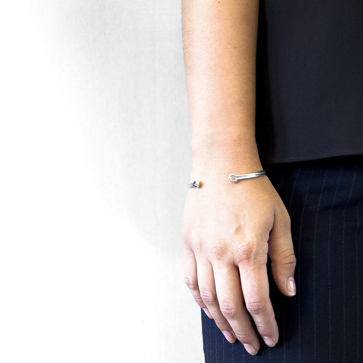 This bangle is skilfully handcrafted from solid 925 sterling silver. It has a midi thickness and a geometric shape with two adjoined barrels.