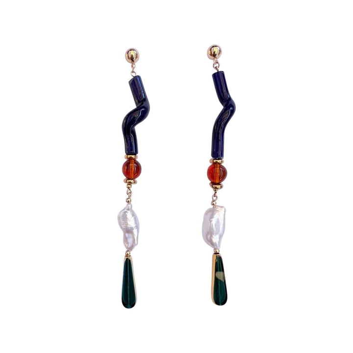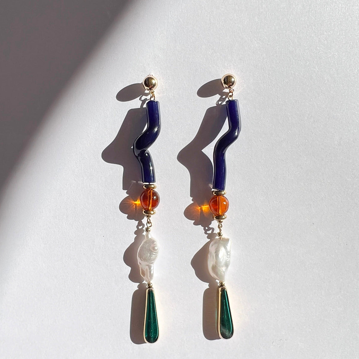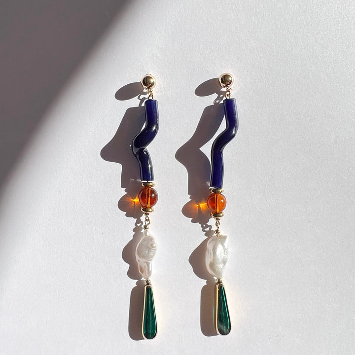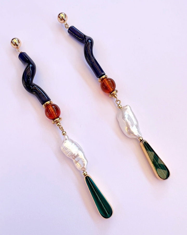 The A Twist Earrings by Aracheli Studio are a gorgeous and unique pair of dangle earrings. They are composed of Biwa pearls, amber-colored glass beads, and a vintage twisted glass bead. These earrings sway beautifully with movement, and the 24-karat vintage German glass beads compliment the design, making them a stunning accessory that catches the light. Due to the vintage nature of the beads, each pair is unique.