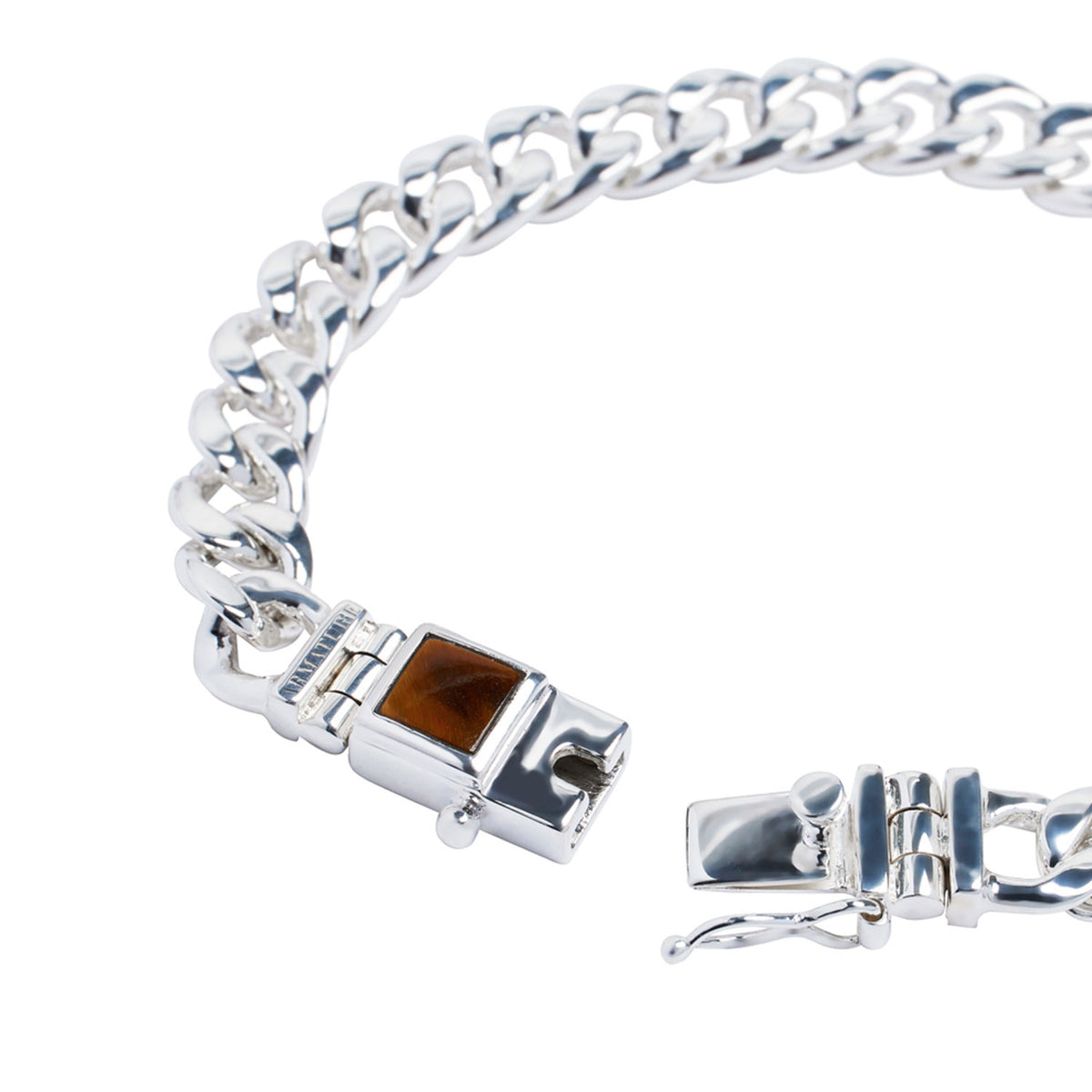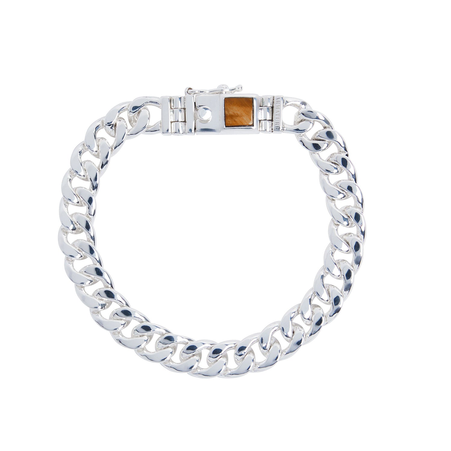 This bracelet is made of sterling silver and features a tiger's eye stone in a curb link chain design. It has a sturdy box clasp with a handset stone. The back of the clasp is engraved with "925" and the Armature logo. Keep it away from harsh chemicals.