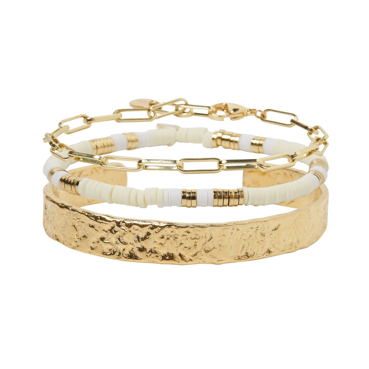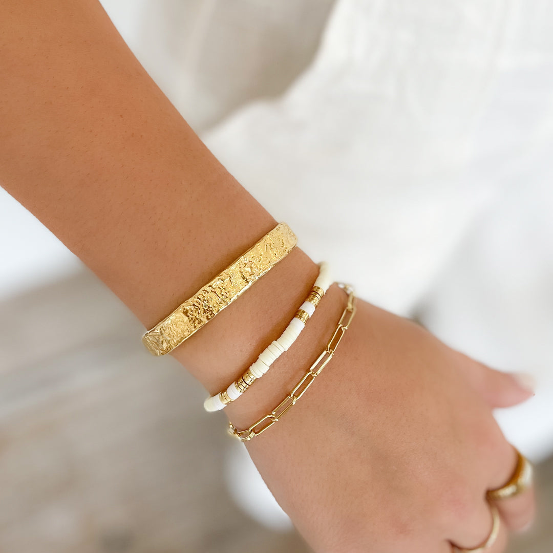 The Savana Bracelet Stack - Sand by Arms of Eve is a stylish and versatile collection that effortlessly completes an everyday look. The stack features a unique mix of textures, including the crushed gold Olivia Cuff, a classic Santana chain bracelet, and a pop of color from the Amari bracelet. This combination creates an elevated and chic aesthetic. Designed for daily wear, this stack is a perfect blend of modern style and vibrant personality.