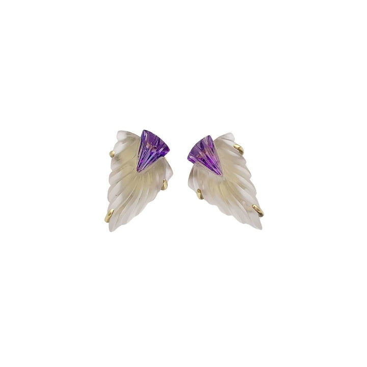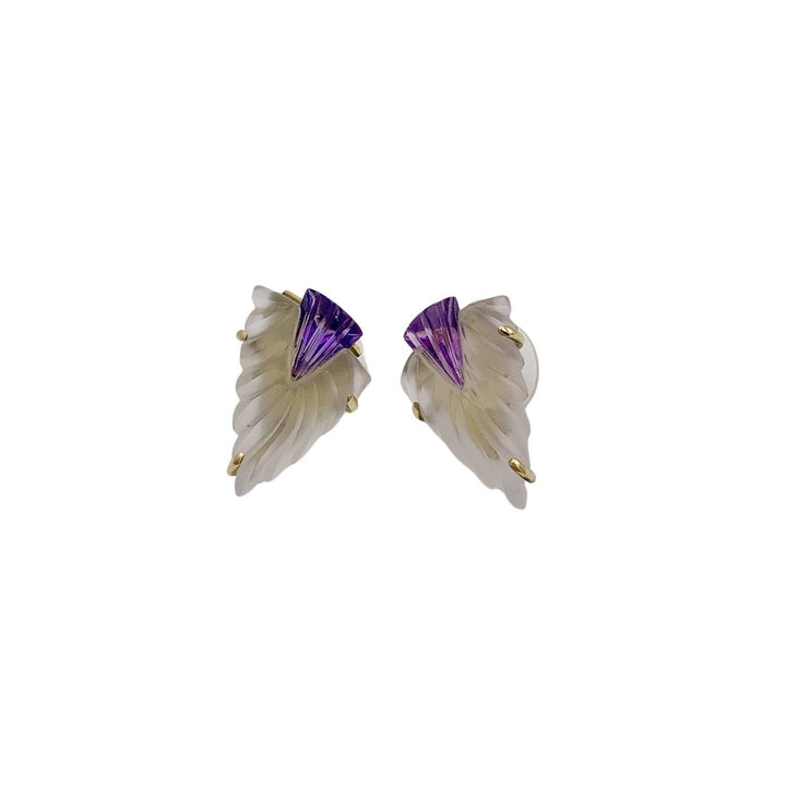 These Amethyst And Rock Crystal Earrings by Arntz are a unique and artful accessory. The artisan earrings are made from amethyst and frosted rock crystal with 14kt yellow gold. The gemstones are artfully carved in an abstract floral design, creating a beautiful and elegant piece.